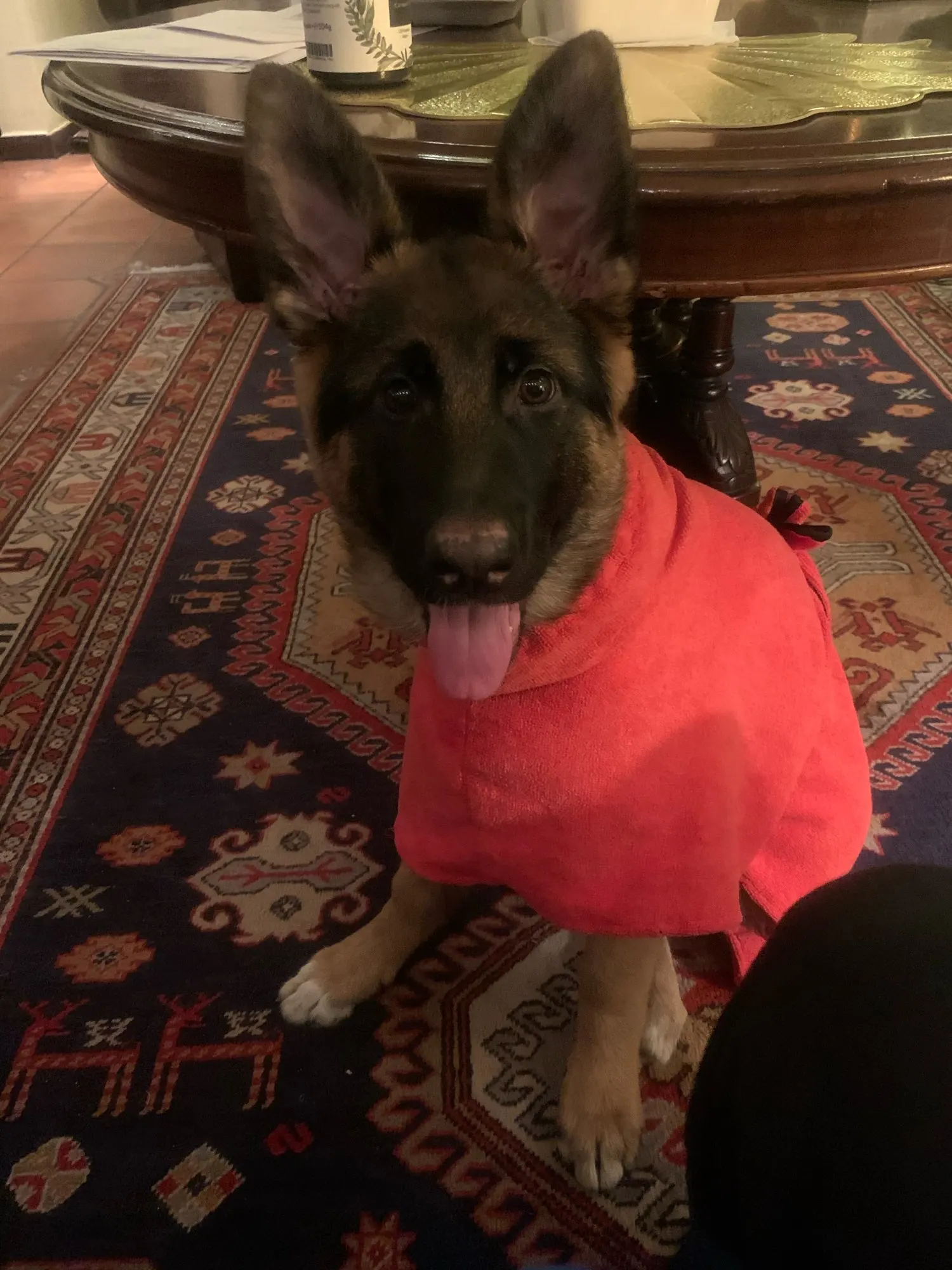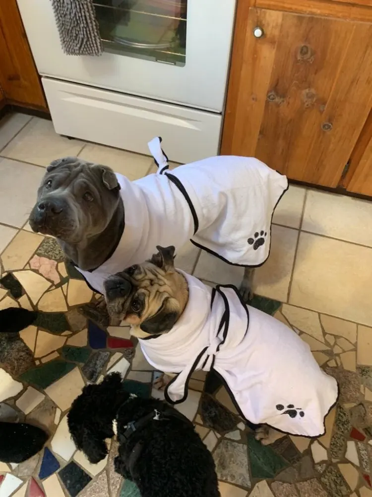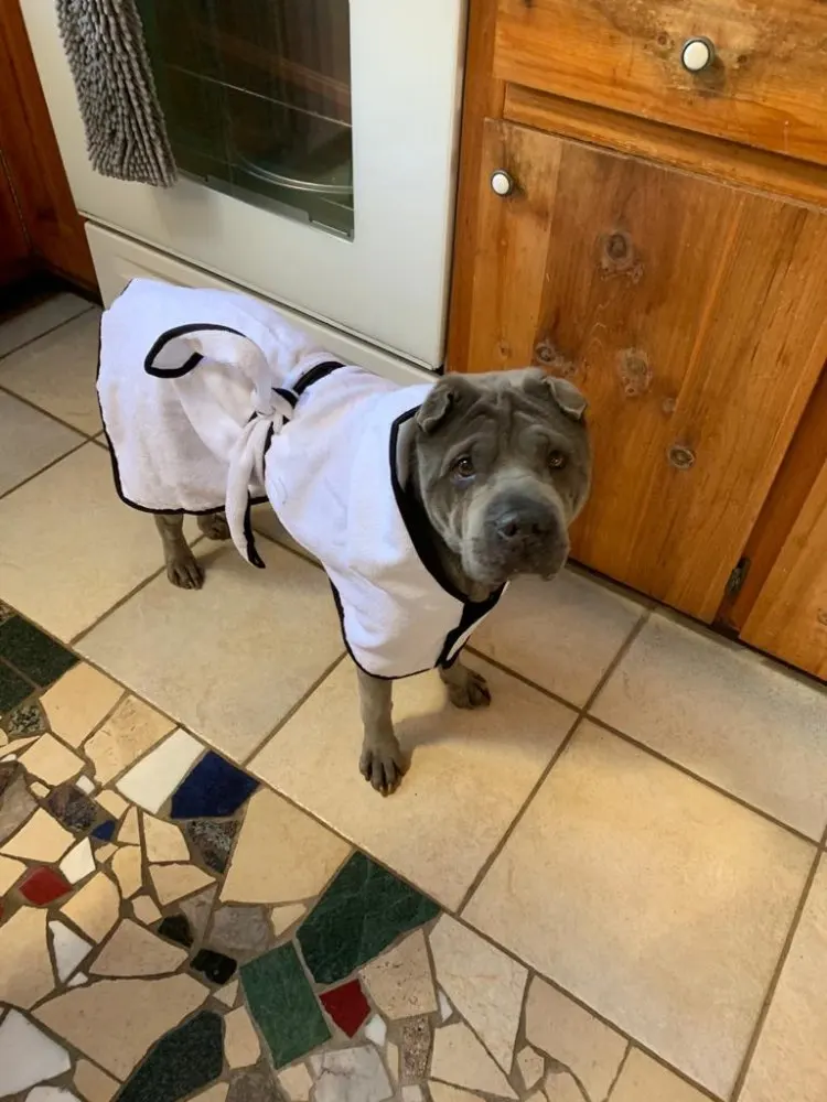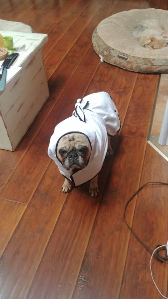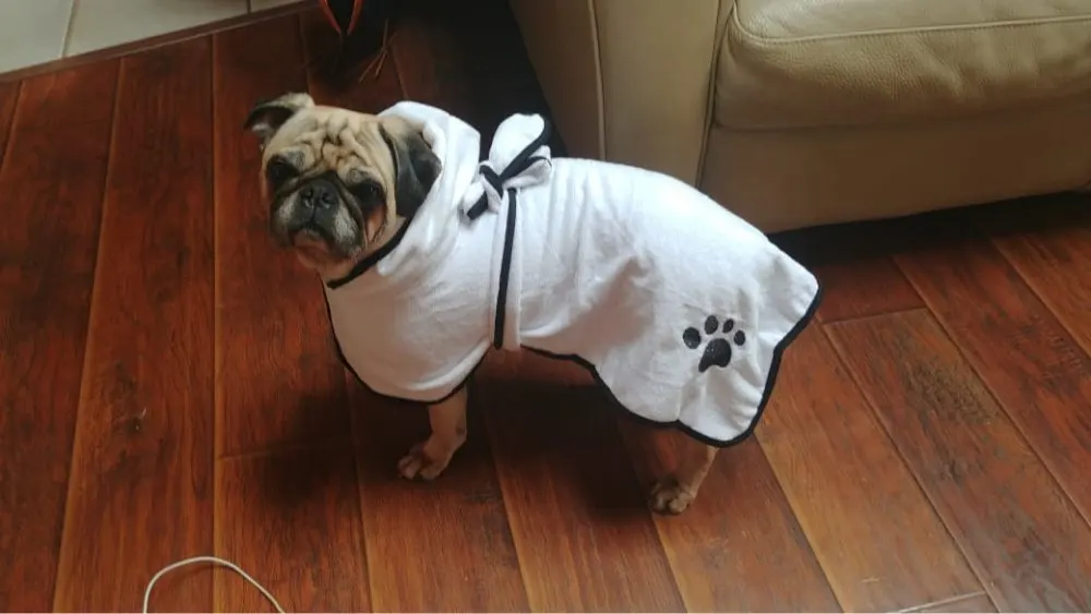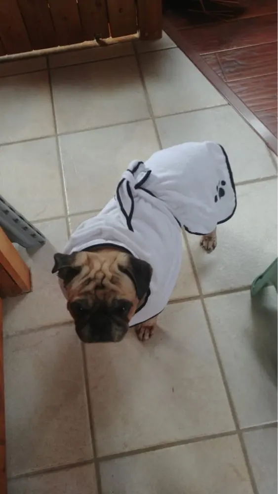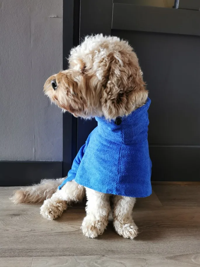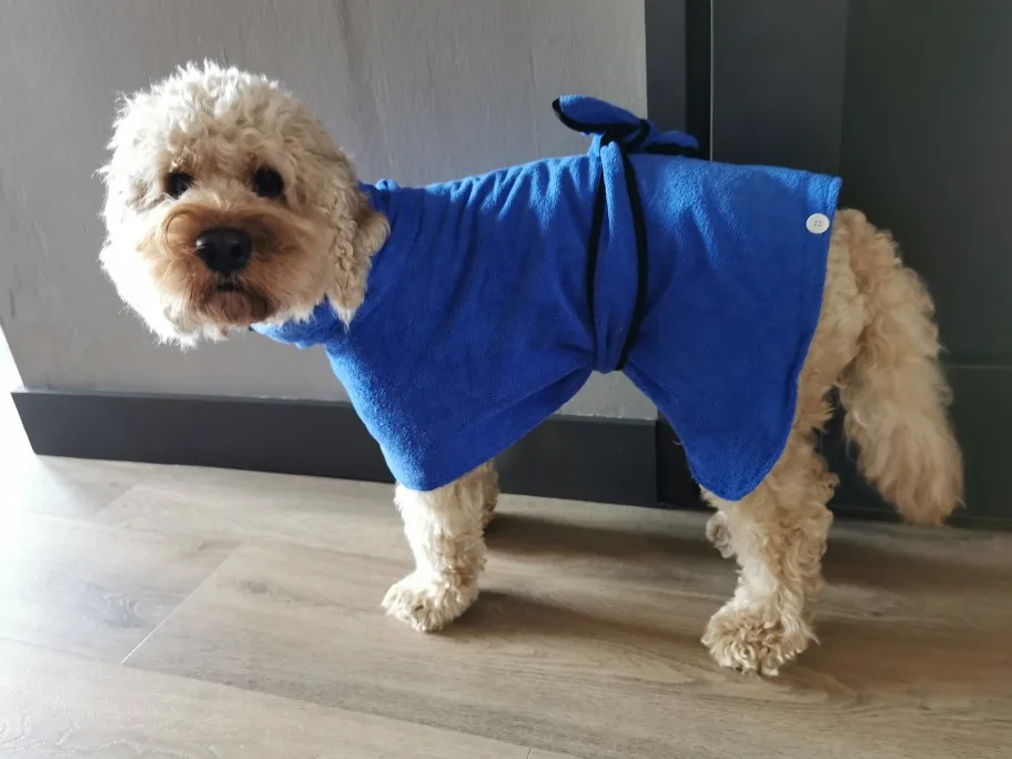 wij hebben een engelse bassethound en de lengte is goed, maar de hoogte is te veel, wat te verwachten was , erg tevreden over de bad jas :)
