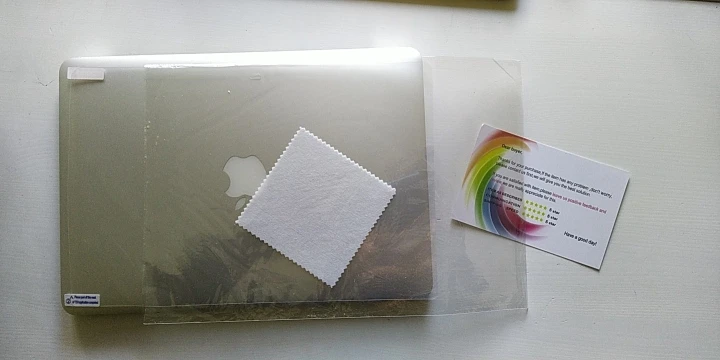 Товар пришел достаточно быстро, в хорошо защищенной упаковке. Сама защитная плёнка в размер экрана MacBookPro13(2015), с допуском на1мм меньше самого экрана. Но без картонной упаковки самой защитной плёнки, с 1 пылесборной салфеткой.