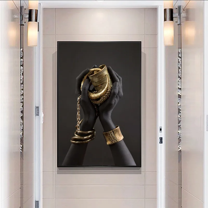 Черная Женская рука с золотыми украшениями, холст, настенные картин...
