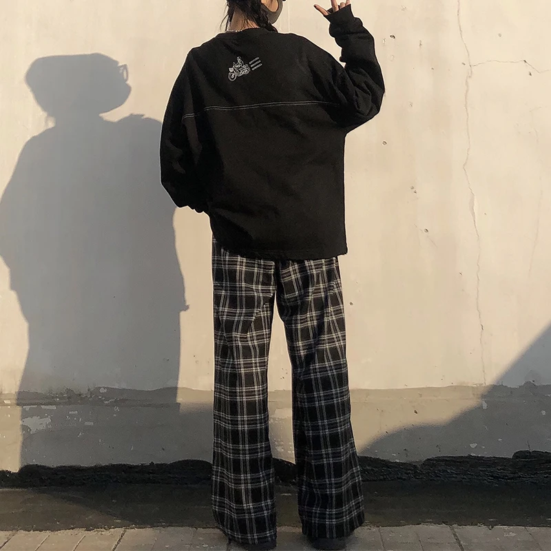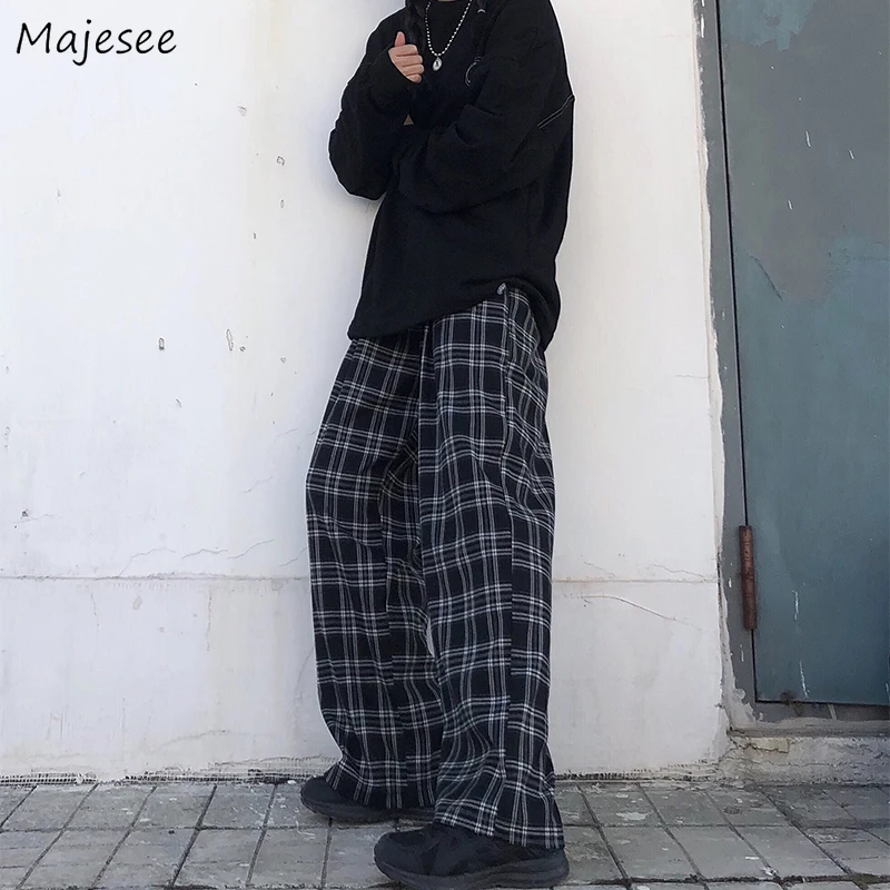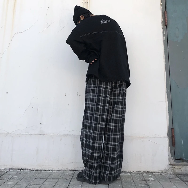 Брюки мужские повседневные в клетку, Модные свободные широкие штаны в стиле ретро, универсальная уличная одежда в стиле Харадзюку, с эластичным поясом, черные белые