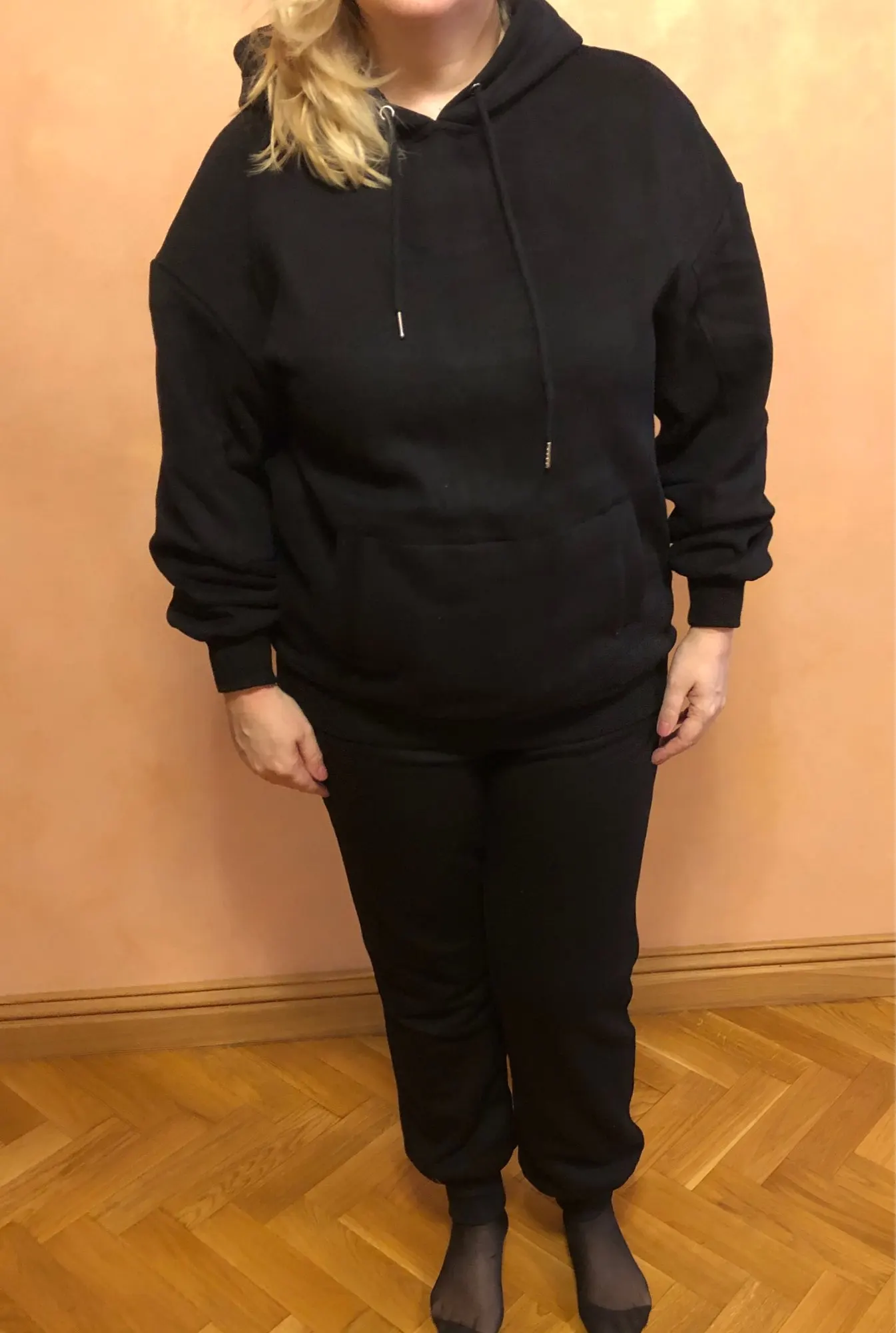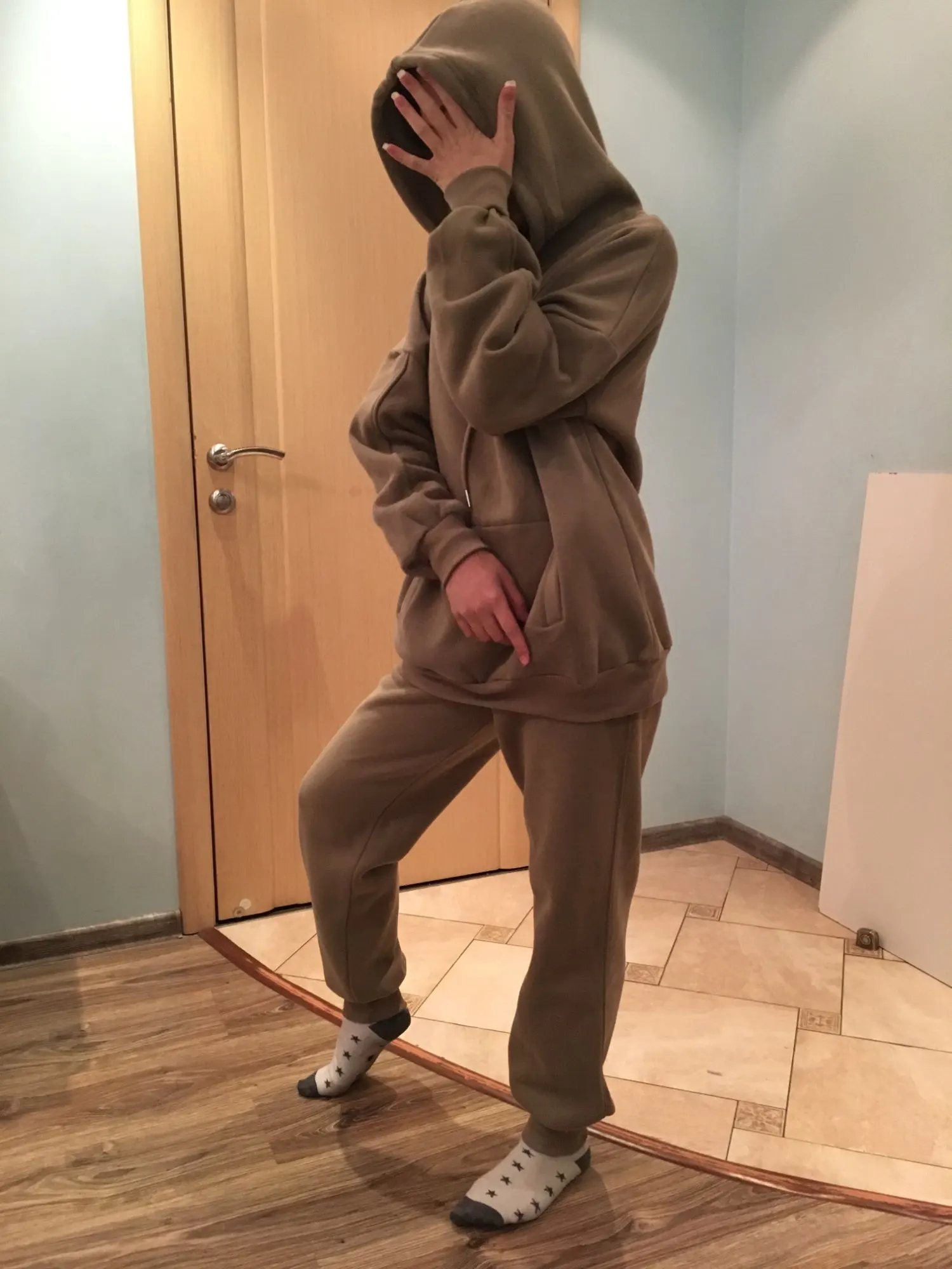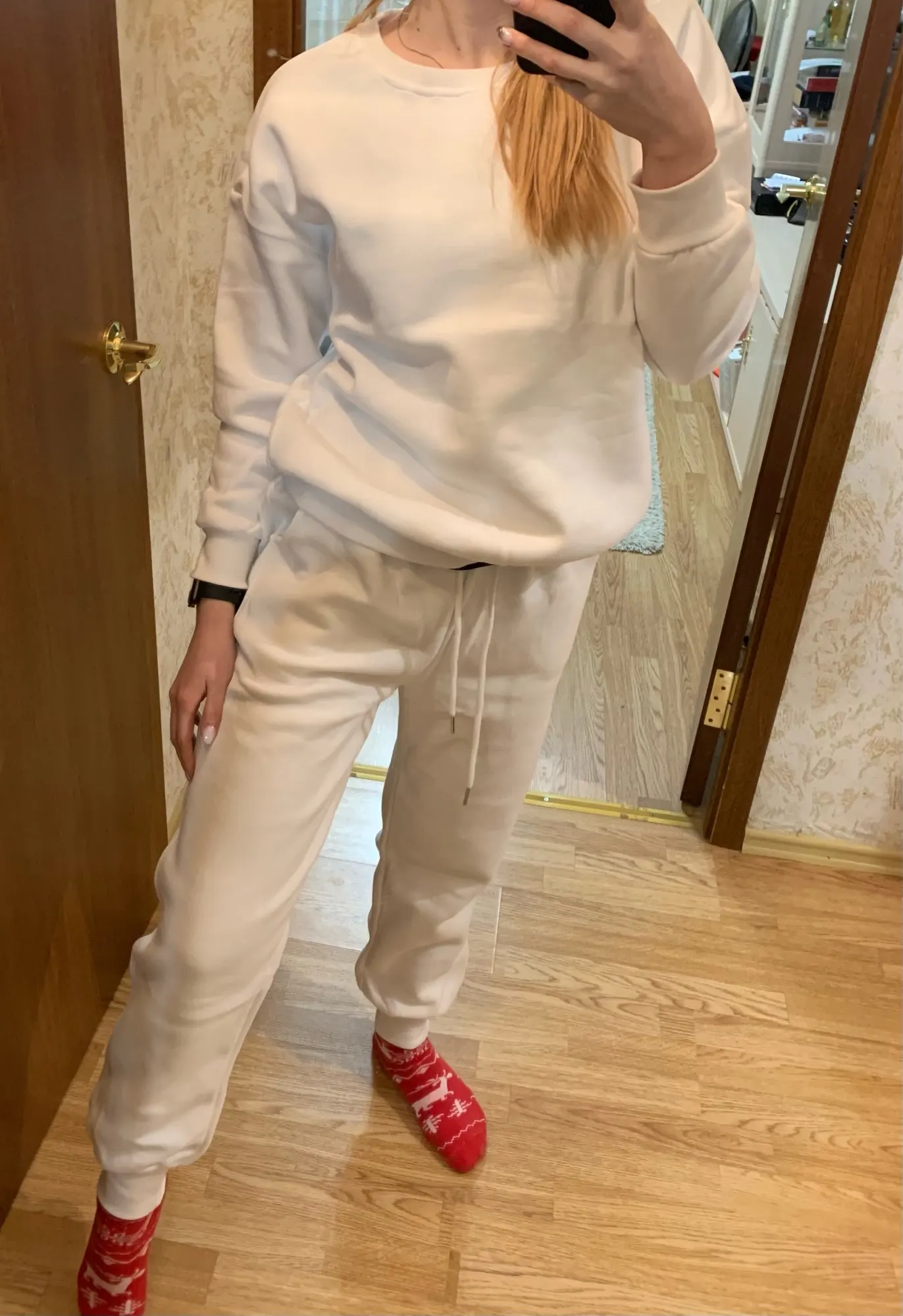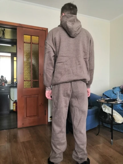 Качество костюма отличное, вопросов никаких. Хлопок снаружи и синтетический начес внутри, очень тёплый. НО: параметры в таблице продавца абсолютно неверные. Брюки в бёдрах обхват 112 см, вместо 118 (размер XL). В итоге на мои 110 костюм просто мал, брюки сидят как лосины, это ужасно :( открыла спор, вернули часть денег, за это спасибо. В итоге лежит, носить нереально. Поэтому рекомендую брать на размер больше, тк вещь маломерит. Толстовка хорошая, оверсайз на грудь 100, здесь нет вопросов. Сидит отлично! До Москвы долетело всего за 5 дней