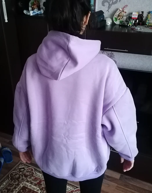Кофта оверсайз, топорщится на животе и спине. Я со своим ростом (163 см) выгляжу как телепузик :D наверно стоило взять на размер меньше