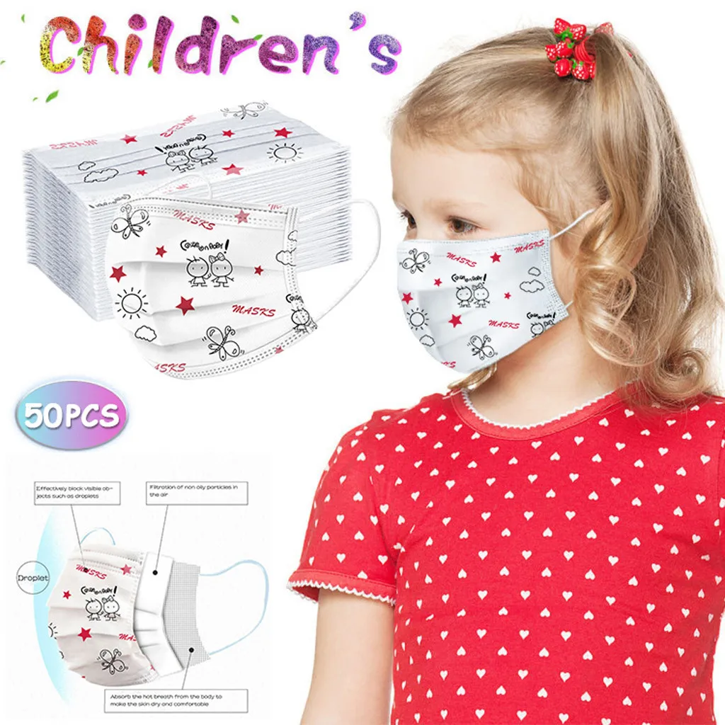 50 шт.пакет одноразовая детская маска для лица с 3-слойным фильтром, дышащая марлевая маска, Мультяшные Милые Маски с милым рисунком для детей