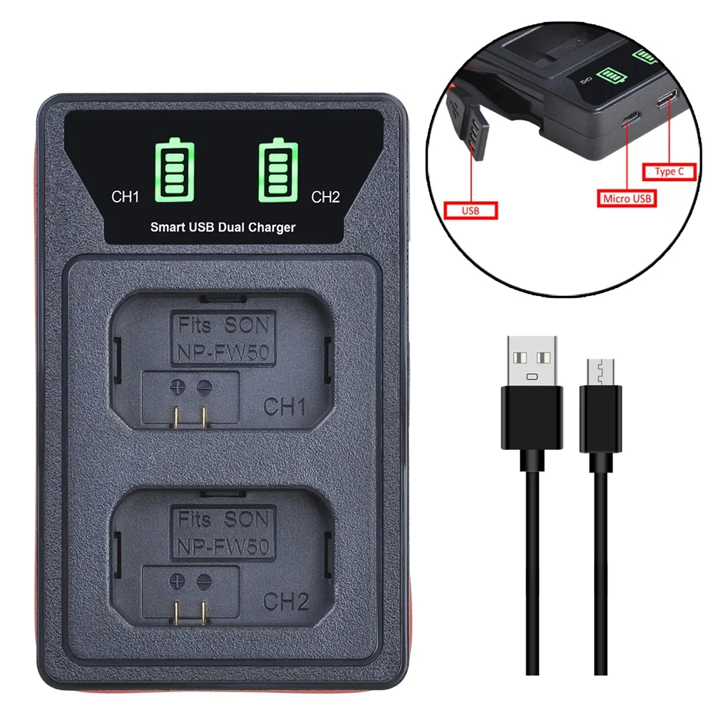 NP-FW50 батарея FW50 + LED двойное зарядное устройство типа C для Sony A6000, A6400, A6500, A6300, A7, A7II, A7RII, A7SII, A7S, A7S2, A7R, A7R2