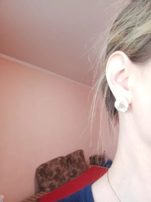 Доставка в Тюмень 2,5 недели. Гвоздики погнулись, выпрямить нетрудно. Мои уши не болят, носила пару раз по несколько часов. Заглушки хорошие, держат. Серьги довольно увесистые, но в ушах не ощущаются. Металл довольно жёлтый, но ещё вполне носибельный.