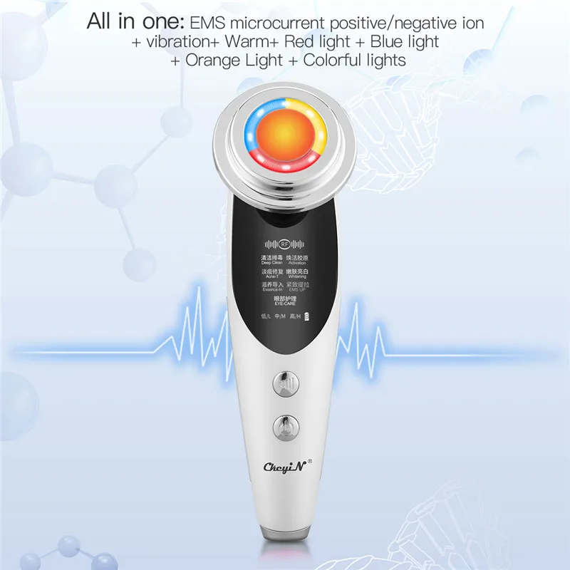 7 режимов:1) режим очистки: глубоко очистите кожу.2) Режим активации: он может помочь восстановить эластичность кожи.3) Режим удаления акне: стимулирует кровообращение и анти-акне.4) Режим отбеливания: отбеливание и Осветление кожи.5) импортный режим: эффективный, чтобы привести лосьон для лучшего поглощения питания.6) режим лифтинга и подтягивания: восстанавливает эластичность кожи, делает кожу подтягивающей и гладкой, против морщин.7) режим ухода за глазами: сгладьте темные круги вокруг глаз.4 светодиодных ламп:1) красный свет: регенерация коллагена.2) синий свет: противовоспалительный и против акне.3) оранжевый свет: отбеливание и Осветление кожи.4) Яркий свет: подтягивающий и укрепляющий.