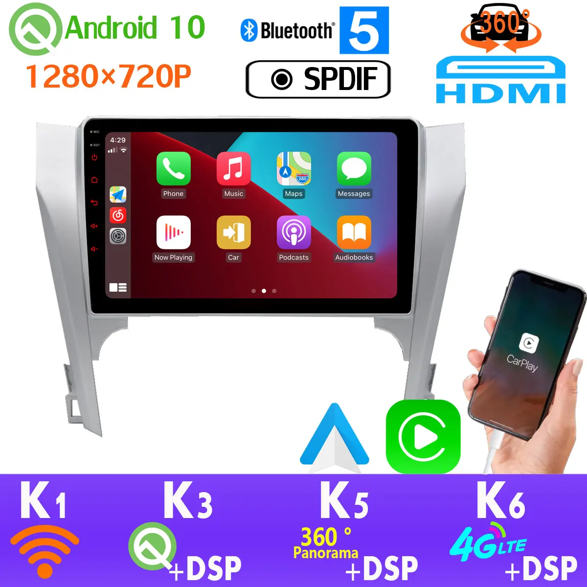 Автомагнитола, 1280*720P, PX6, 4 + 64 ГБ, Android 10,0 для Toyota Camry v50 360, 4 * AHD-камеры, GPS, радио, CarPlay, 4G, LTE, Wi-Fi, DSP, головное устройство, SPDIF, авто