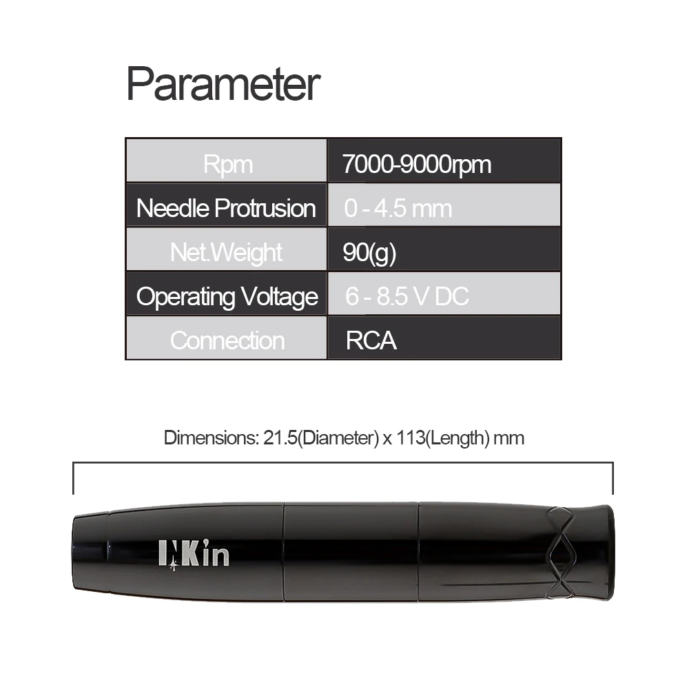 -Двигатель: Япония DC Coreless Motors-Подключение: RCA-Материал: авиационный алюминий-Длина хода: 2,0 мм для PMUЧетырехтактный двигатель с Длина: 3,0 мм для татуировки и ударов-Рабочее Напряжение: 6-8,5 V DC-Об/мин: 7000-9000 об/мин-Игла выступа: 0-4,5 мм-Вес нетто: 90 (г)-Размеры: 21,5 (Диаметр) x 113 (Длина) мм-1 шт. RCA шнур и дополнительная моторная камера
