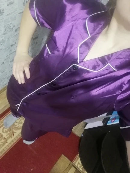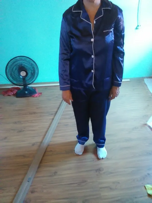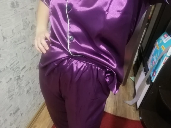 Отличная пижама, очень красиво смотрится, приятная к телу. Красивые пуговицы, сшита качественно. После стирки цвет не изменился, всё замечательно. На параметры ОГ 89 ОТ 78 ОБ 99 заказала размер L, надо было на размер больше брать, так как штаны сели впритык, хотелось свободнее.