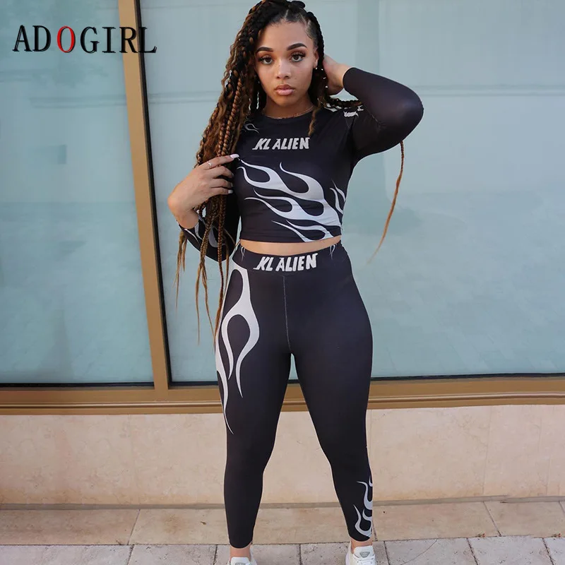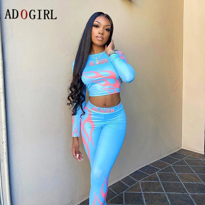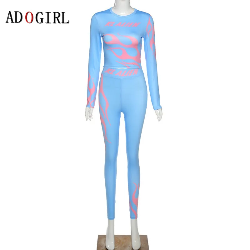 Женский спортивный костюм с буквенным принтом Adogirl, комплект из 2 предметов, топ с длинными рукавами + леггинсы, повседневный уличная одежда