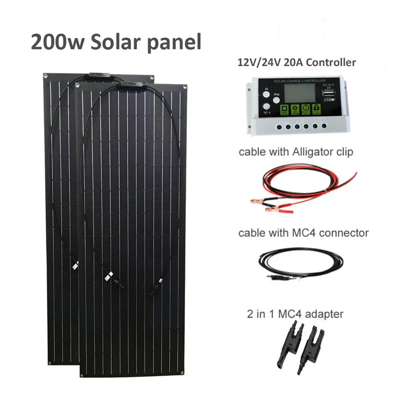 Комплект панелей солнечных батарей 200 Вт etfe с контроллером заряда солнечных батарей 20A, кабель солнечных батарей 3 м со штекером и гнездом, зарядное устройство 12 В24 В