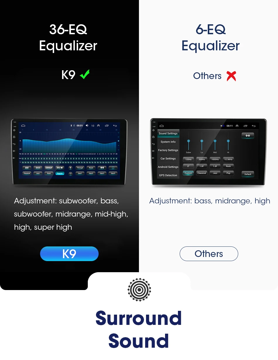 Объемный звук Мы не можем изменить положение 4 динамиков автомобиля, но мы можем изменить время поступления звука в ухо. Всегда чувствуйте, что звук слева больше, потому что спикер слева ближе к вам, трудно создать хорошее ощущение трехдиментного пространства. Благодаря технологии задержки, позвольте левому динамику задержать звук в 2,5 миллисекунд, и почувствуйте, что вы находитесь в центре концертного зала.