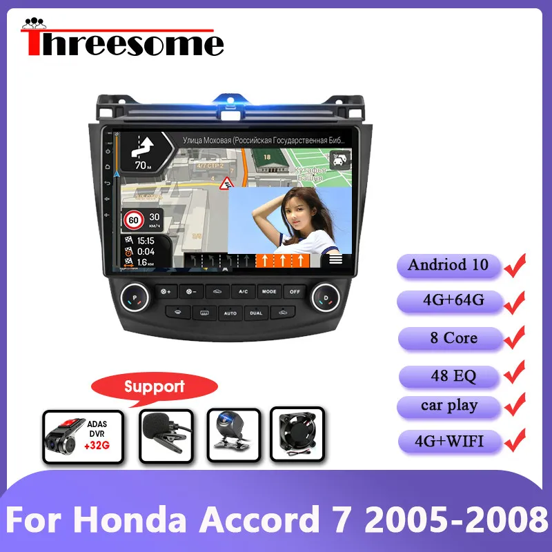 Автомобильный радиоприемник, 10 дюймов, Android 10,0, 4G Net 48EQ, для Honda Accord 7 2005-2008, RDS, DSP, IPS, GPS-навигация, 4G + 64G, мультимедийный видеоплеер