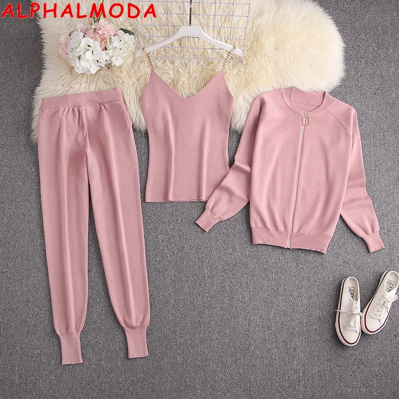Женский трикотажный кардиган ALPHALMODA, комплект из трех предметов, жилет на цепочке и брюки, удобный трикотажный спортивный костюм для бега на осень и зиму