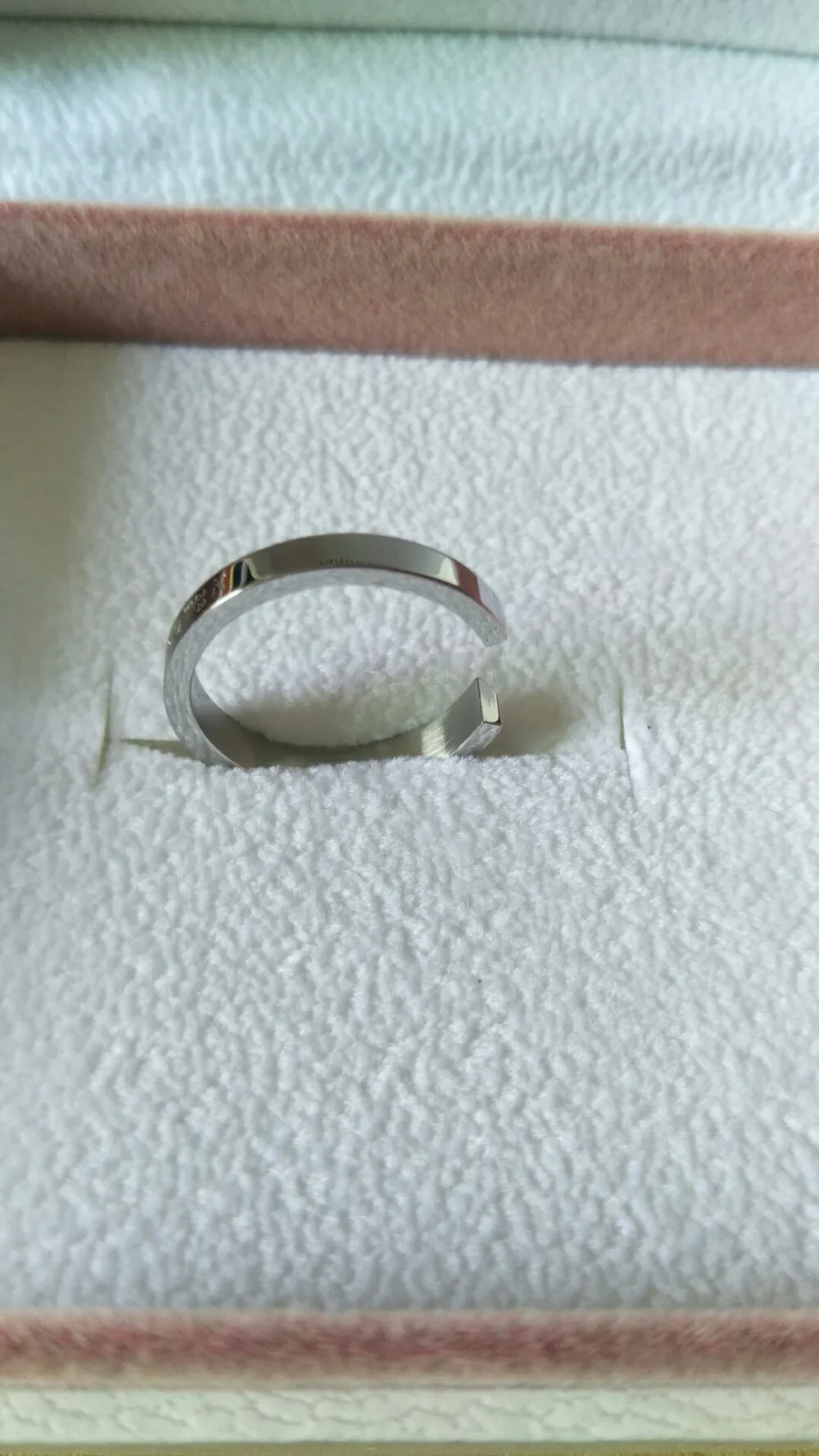 Не думала что будет с надписью размером 4 мм.на кольце написано Daniel Wellington. Одна сторона кольца плотно прилегает к пальчику, вторая срезана будто бы, удобно к этой стороне одевать кольцо-силитер. В целом хорошее колечко, посмотрим как покажет себя в эксплуатации.