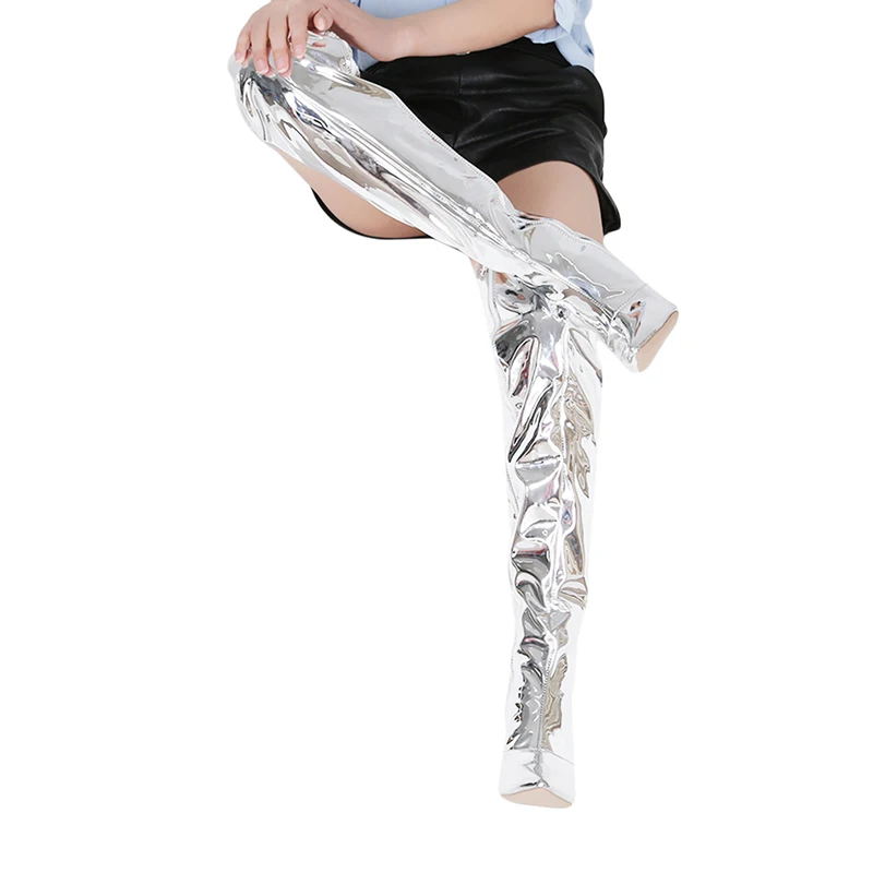 Пикантные Серебристые сапоги до бедра с зеркальным покрытием женски...