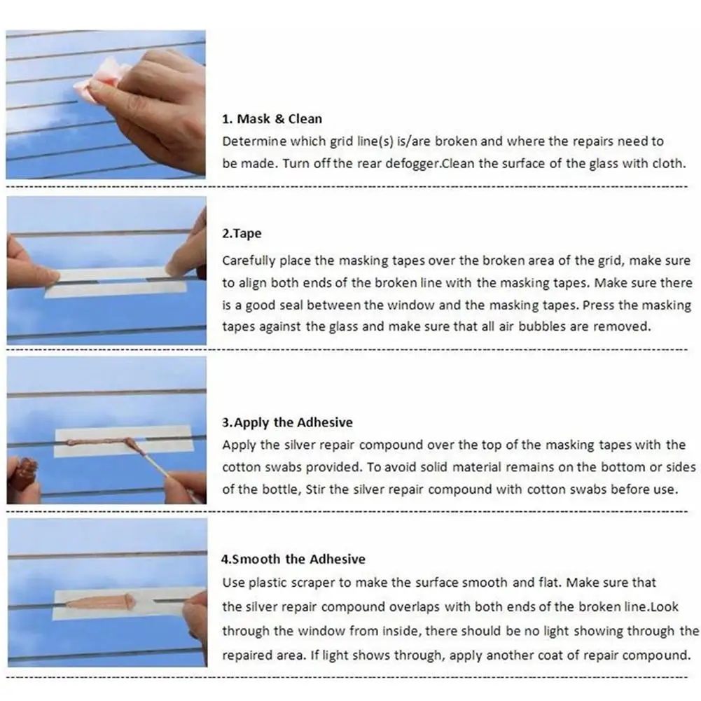 Описание:Набор для ремонта зеркал заднего стекла предназначен для ремонта поцарапанных или сломанных линий защиты заднего стекла. Приклеиваемые поверхности должны быть гладкими и плоскими. Ремонт может быть сделан в идеале при температуре от (10 до 24 градусов Цельсия). Это обеспечивает низкую стоимость, высокое качество ремонта для поврежденных задних окон размораживания сетки и вкладки.Особенности:1. Используется для ремонта поцарапанных или сломанных линий сетки заднего окна.2. Сделать постоянный, невидимый ремонт.3. Быстро и легко исправить с дешевой ценой.4. Клей специально разработан для проведения электричества.5. Следуйте инструкциям легко за шагом.Инструкция:Step1.Определите, какая сетка сломана и где необходимо сделать ремонт, выключите заднюю решетку. Очистите поверхность стекла тканью.Шаг 2.Аккуратно поместите ленты для маскировки на сломанную область сетки. Не забудьте выровнять оба конца сломанной линии с маскировочными лентами. Убедитесь, что между окном и маскировочными лентами имеется хорошее уплотнение. Прижмите клейкие ленты к стеклу и убедитесь, что все воздушные пузырьки удалены.Шаг 3.Нанесите серебряное Ремонтное соединение на верхнюю часть маскирующих лент с помощью хлопчатобумажных тампонов. Чтобы не допустить попадания твердого материала на дно или по бокам бутылки, перемешайте серебряное Ремонтное соединение ватными тампонами перед использованием,Шаг 4.Используйте пластиковый скребок, чтобы сделать поверхности гладкими и плоскими. Убедитесь, что серебряное Ремонтное соединение перекрывает оба конца сломанной линии. Посмотрите через окно изнутри, светильник не должен быть показан через отремонтированную область. Если светильник просвечивается, нанесите другой слой ремонтной смеси.Шаг 5.Немедленно снимите ленты для маскировки.Шаг 6.После удаления маскирующих лент высушите серебряное Ремонтное соединение.(A) лечение в течение 15-20 минут, если сушить естественным образом.(B) лечение в течение 2-5 минут при сушке с помощью сушилки для волос.Шаг 7.Очистите дополнительное серебряное Ремонтное соединение на стекле с помощью спиртовой подготовительной прокладки. Подождите 24 часа, прежде чем включить defogger.Упаковочный лист:1x2 мл Серебряная ремонтная смесь1 х лента для маскировки1 x чистая ткань1 х ватные тампоны1 х спиртовая заготовкаПластиковый скребок-1 шт.1 x Инструкция