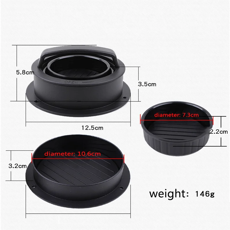 Дизайн простой, АБС-пластик, нетоксичен и безвреден, размер 12,5*12,5*6 см, а вес составляет около 160 г. Его можно использовать для изготовления котлеты для гамбургеров и выпечки, а также использовать для приготовления говяжьих пирожных.