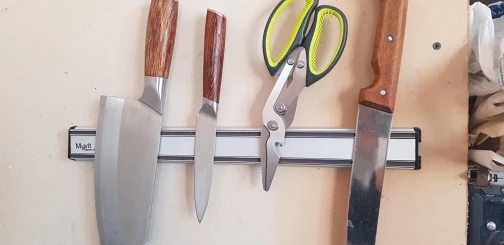 магниты хорошо держат легкие ножи, а вот тяжелые, с толстым лезвие надо размещать очень аккуратно и точно. Вывод - магниты надо было пошире сделать
