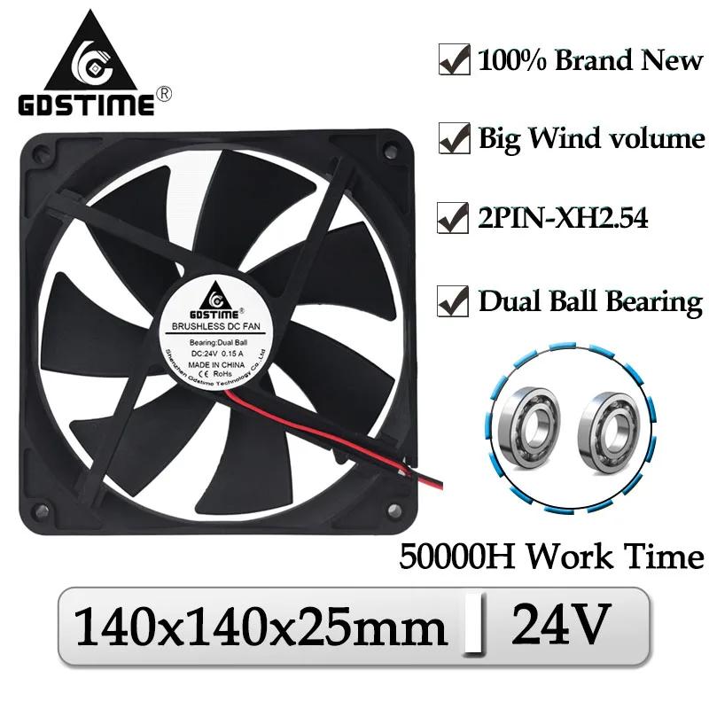 Gdstime DC 24 В 140x140x25 мм 140 мм двойной шар 2PIN чехол для компьютера ПК кулер безщеточный вентилятор охлаждения постоянного тока