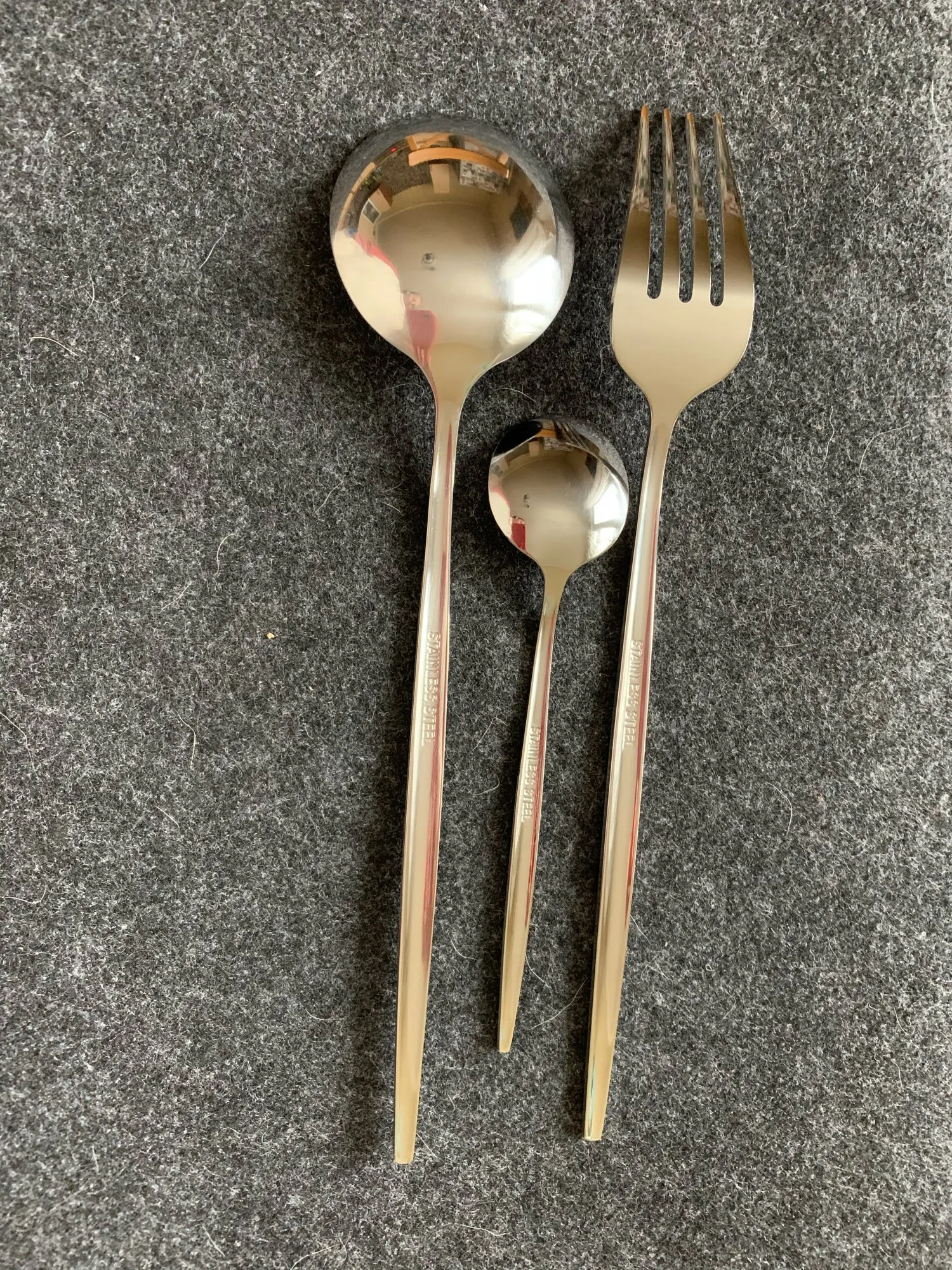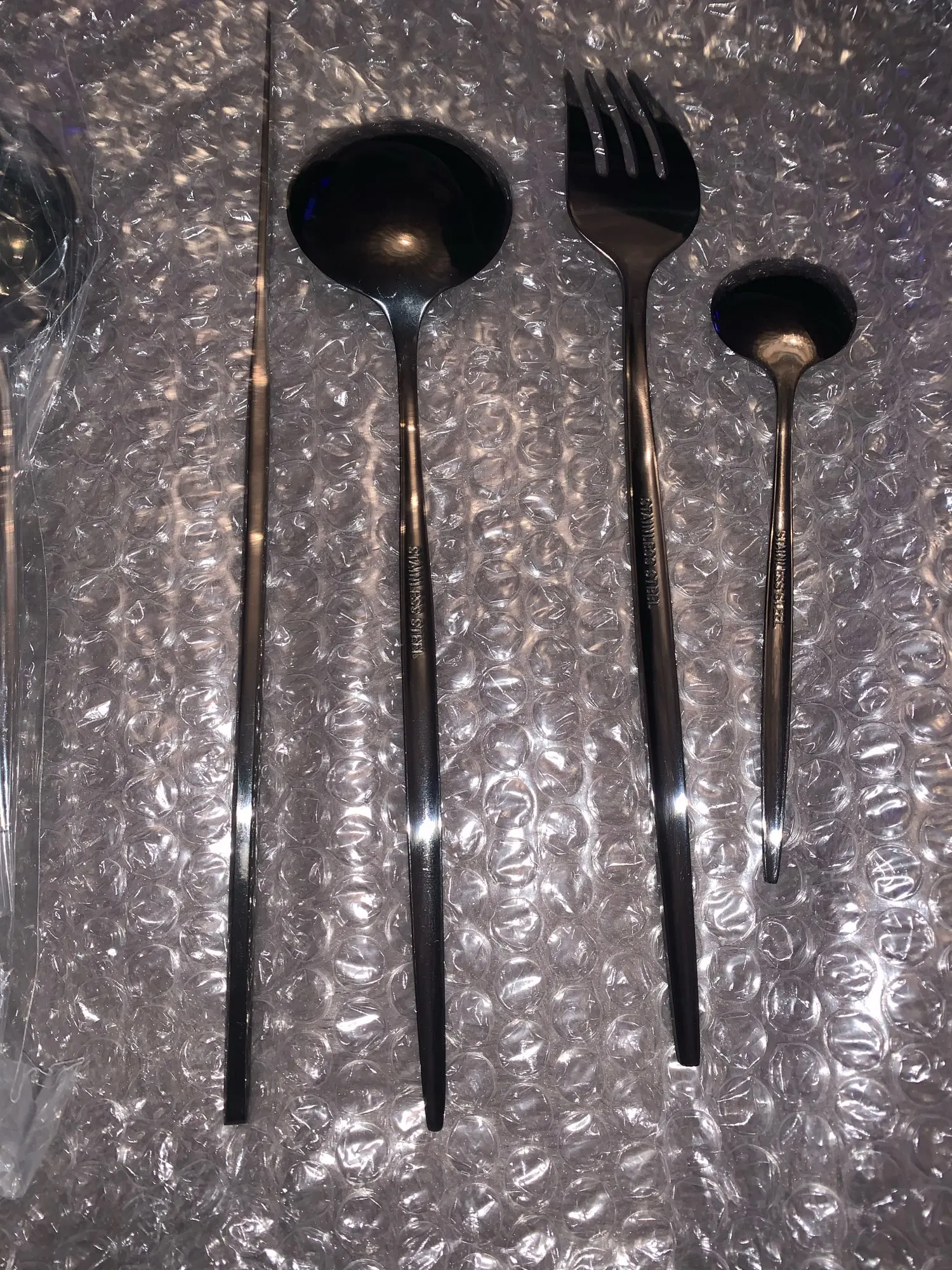 Хорошие столовые приборы, посудомойку выдержали «на ура». Упакованы отлично, каждый прибор в пакетике+пупырка, но все равно нашла пару царапин на одной вилке. В общем довольна, но есть пару «но». Например вид сзади. Доставка до мск за 4 дня.