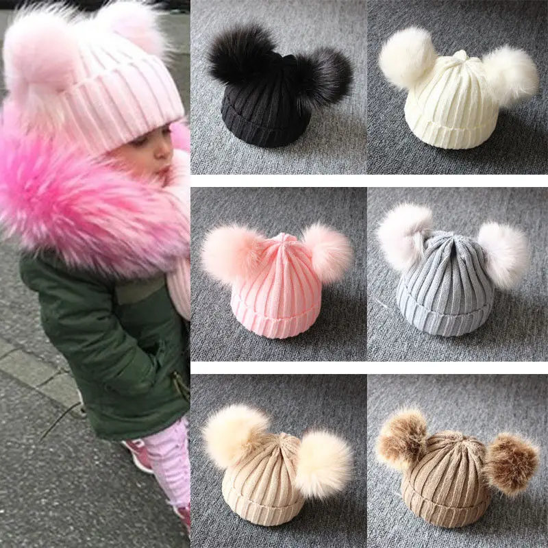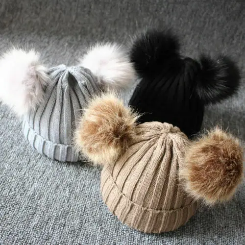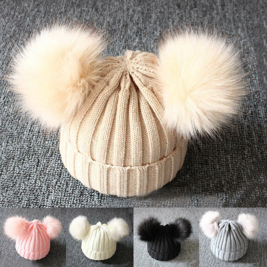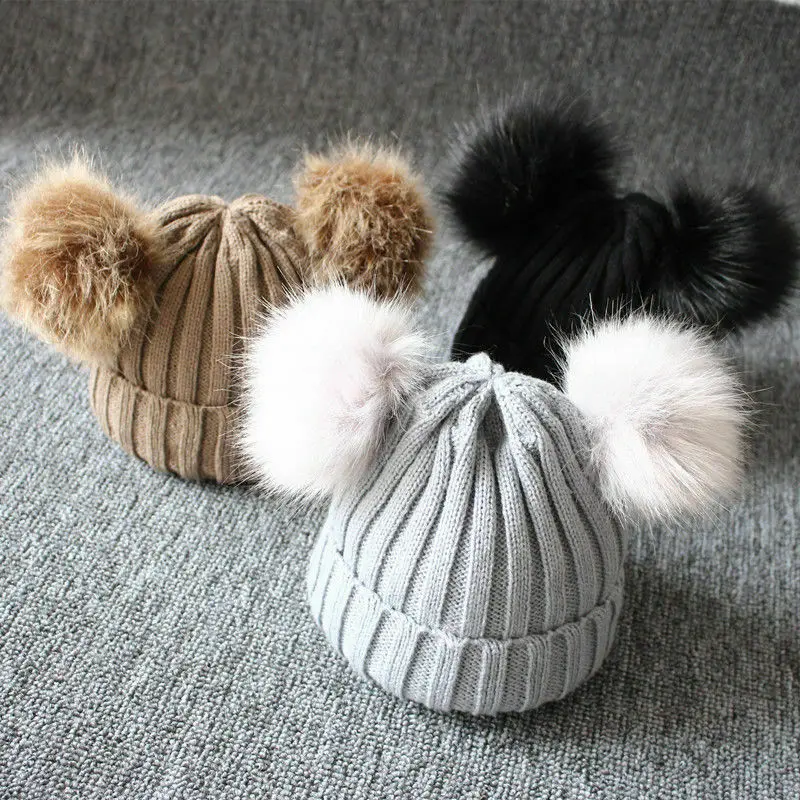 Шапка-бини для мальчиков и девочек, зимняя теплая однотонная, с меховыми помпонами, 2019