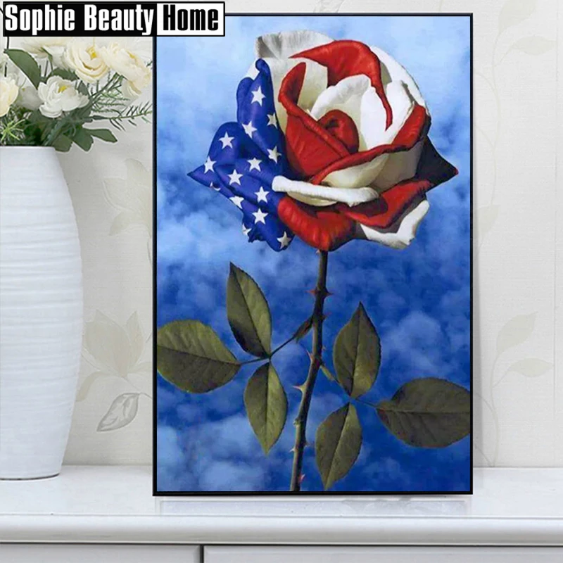 Американский флаг, роза, алмазная картина, полная дрель, Цветочный декор, сделай сам, мозаика, вышивка 5D, вышивка крестом, домашний декор, 204150