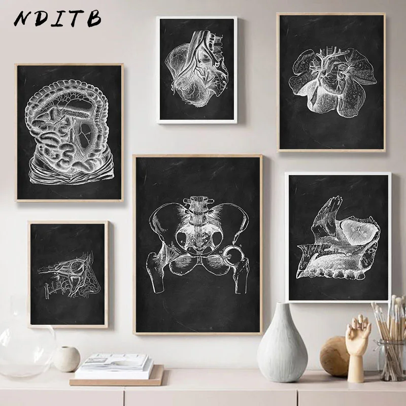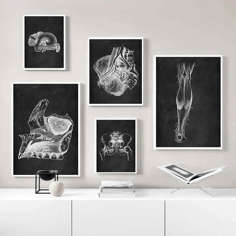 Черно-белая Анатомия человека, медицинская настенная Художественная печать, скелет органов, карта тела, картина в скандинавском стиле, холст, плакат, образовательная живопись