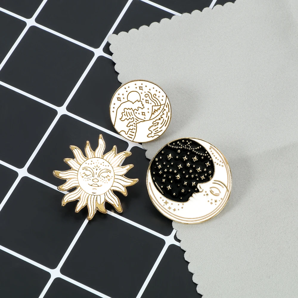 Эмалевые булавки в виде морской волны, брошка на лацканы, солнце, луна, звезды, круглый золотой значок, мультяшный рюкзак в японском стиле для женщин и мужчин, Ювелирное Украшение