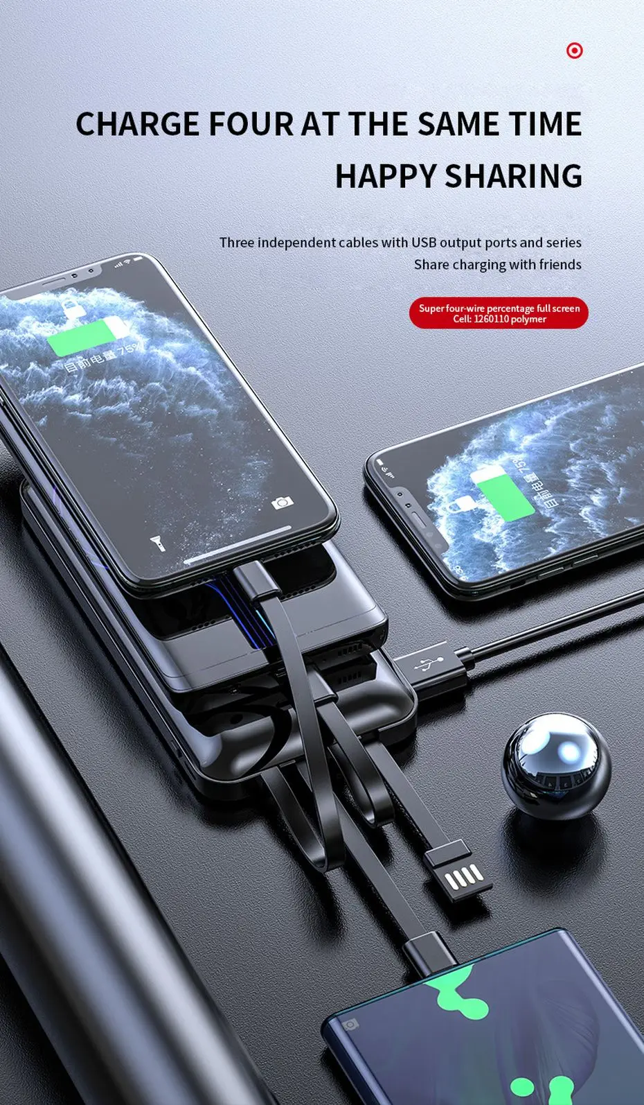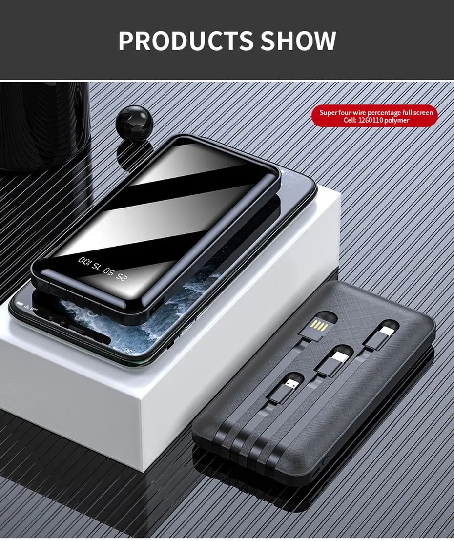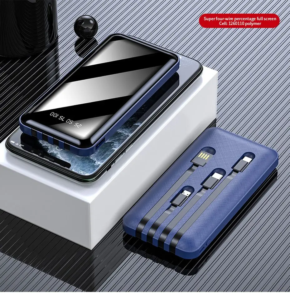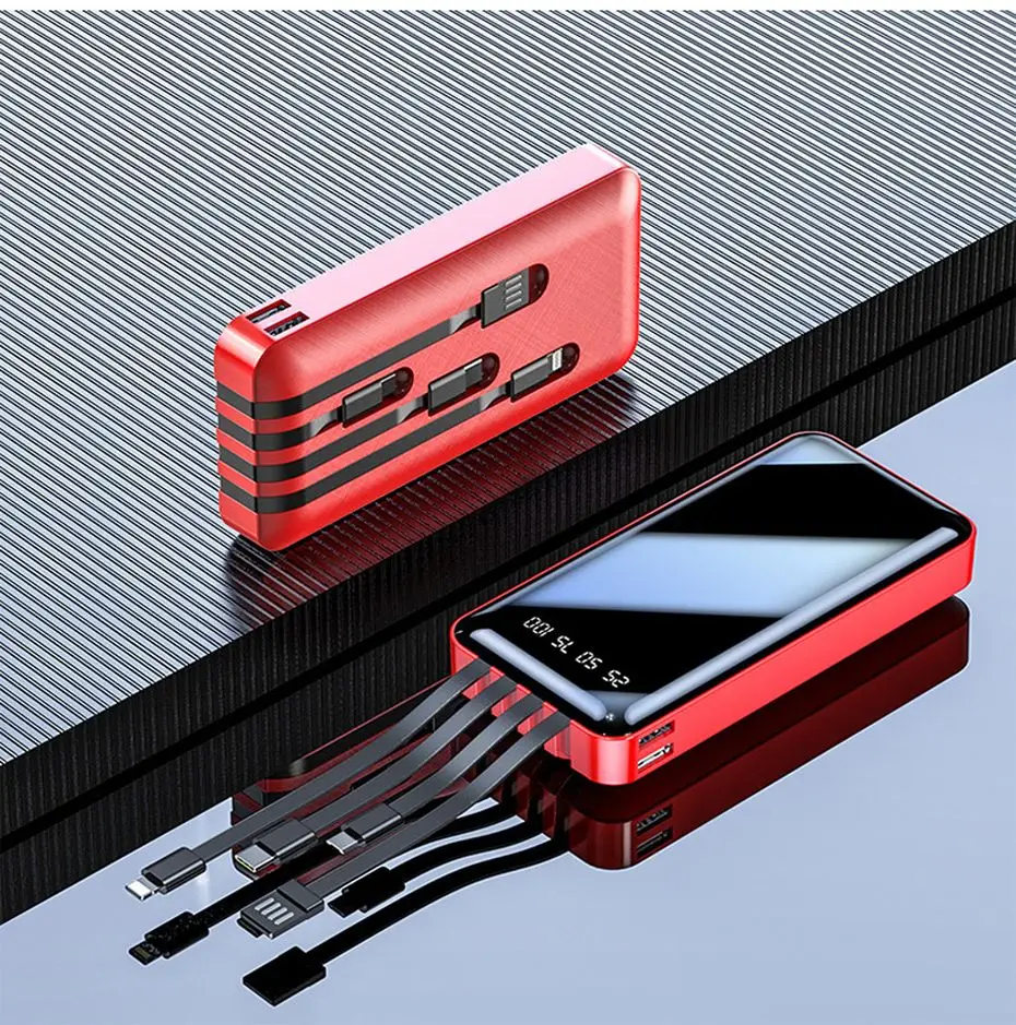Портативное зарядное устройство PINZHENG, 20000 мАч, 4 встроенных кабеля, быстрая зарядка, внешний аккумулятор для iPhone, Xiaomi