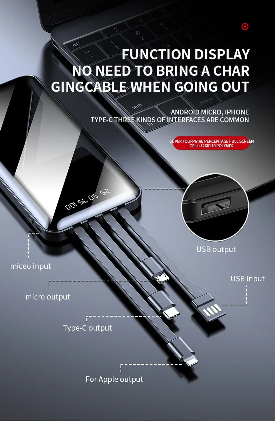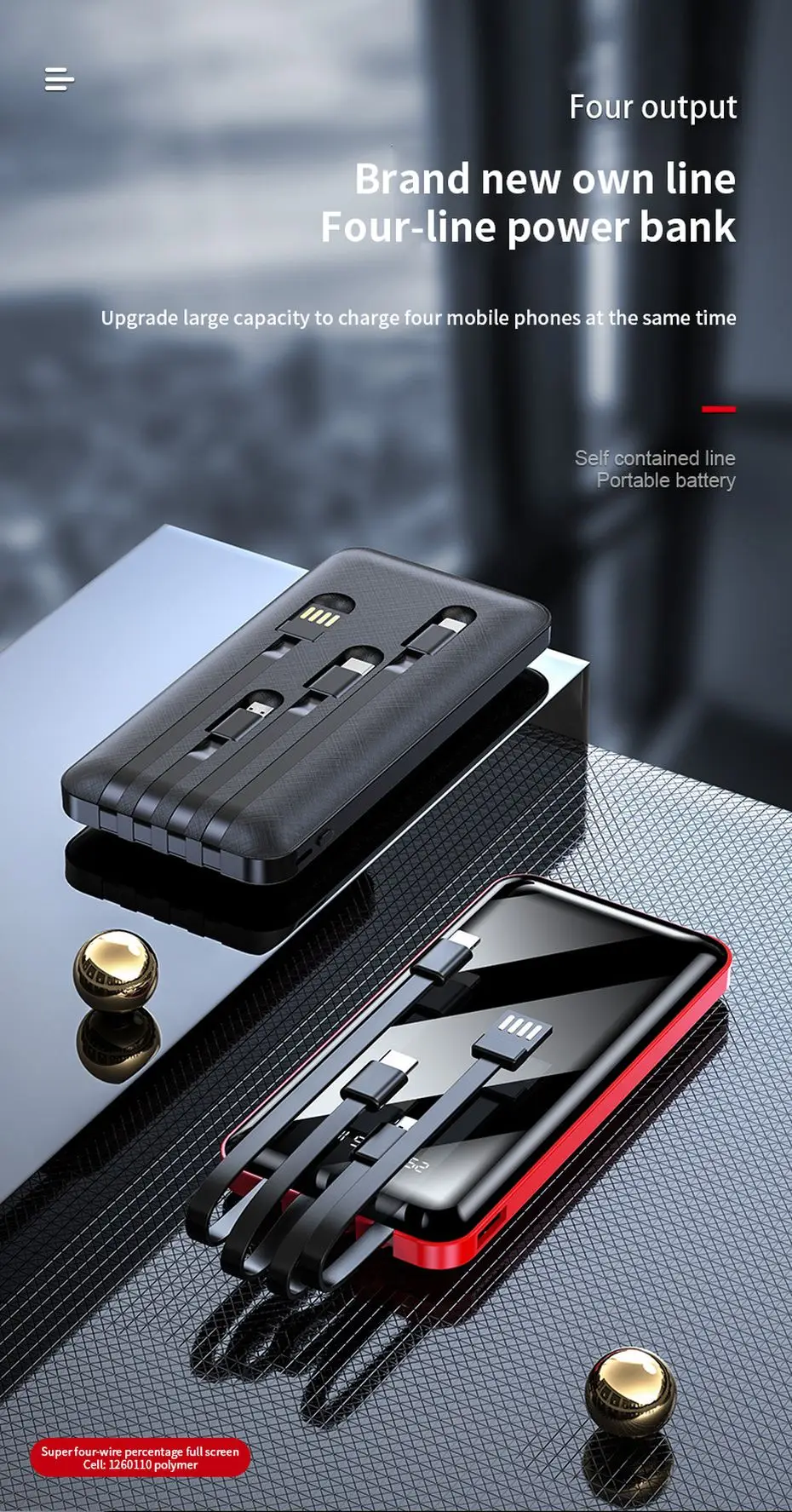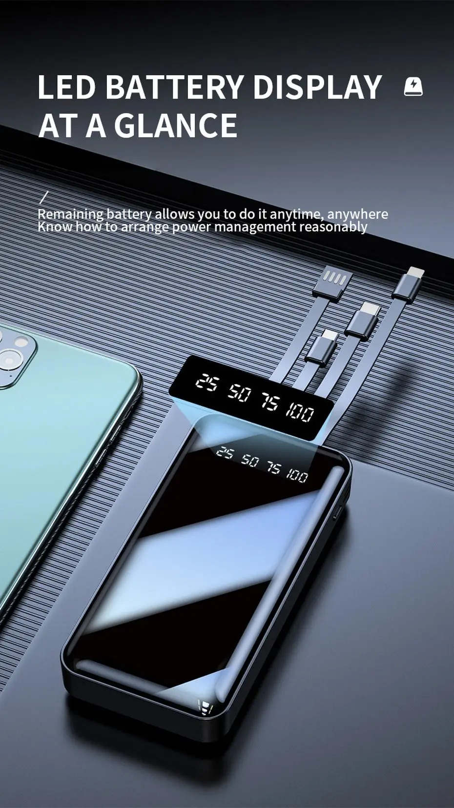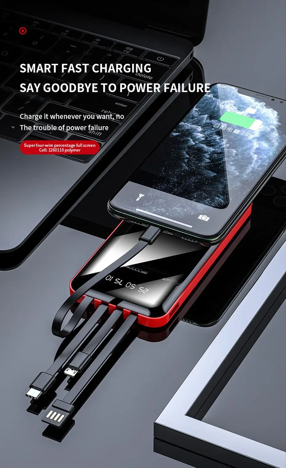 Портативное зарядное устройство PINZHENG, 20000 мАч, 4 встроенных кабеля, быстрая зарядка, внешний аккумулятор для iPhone, Xiaomi