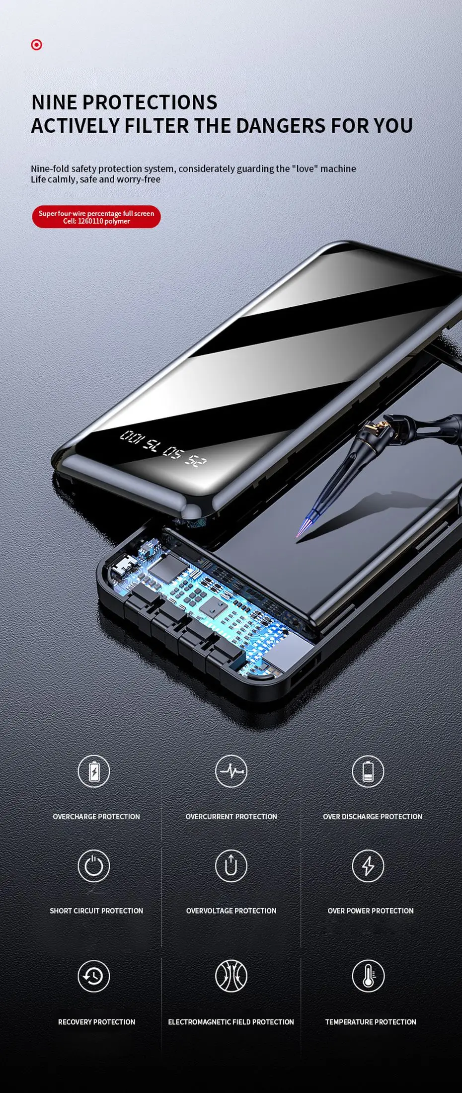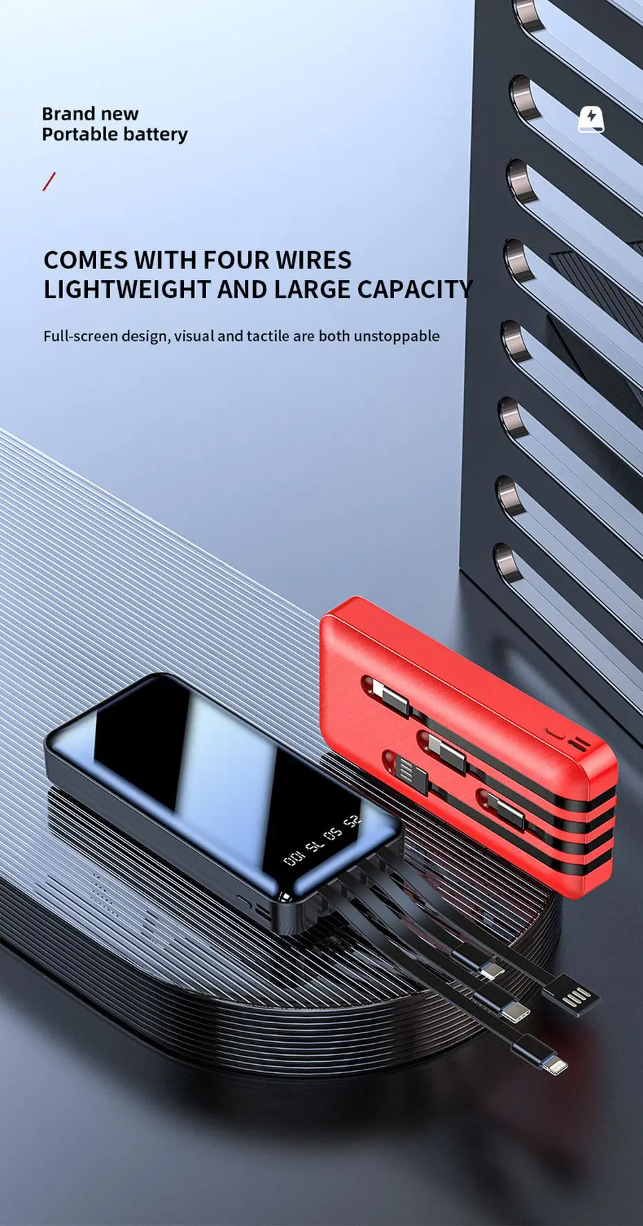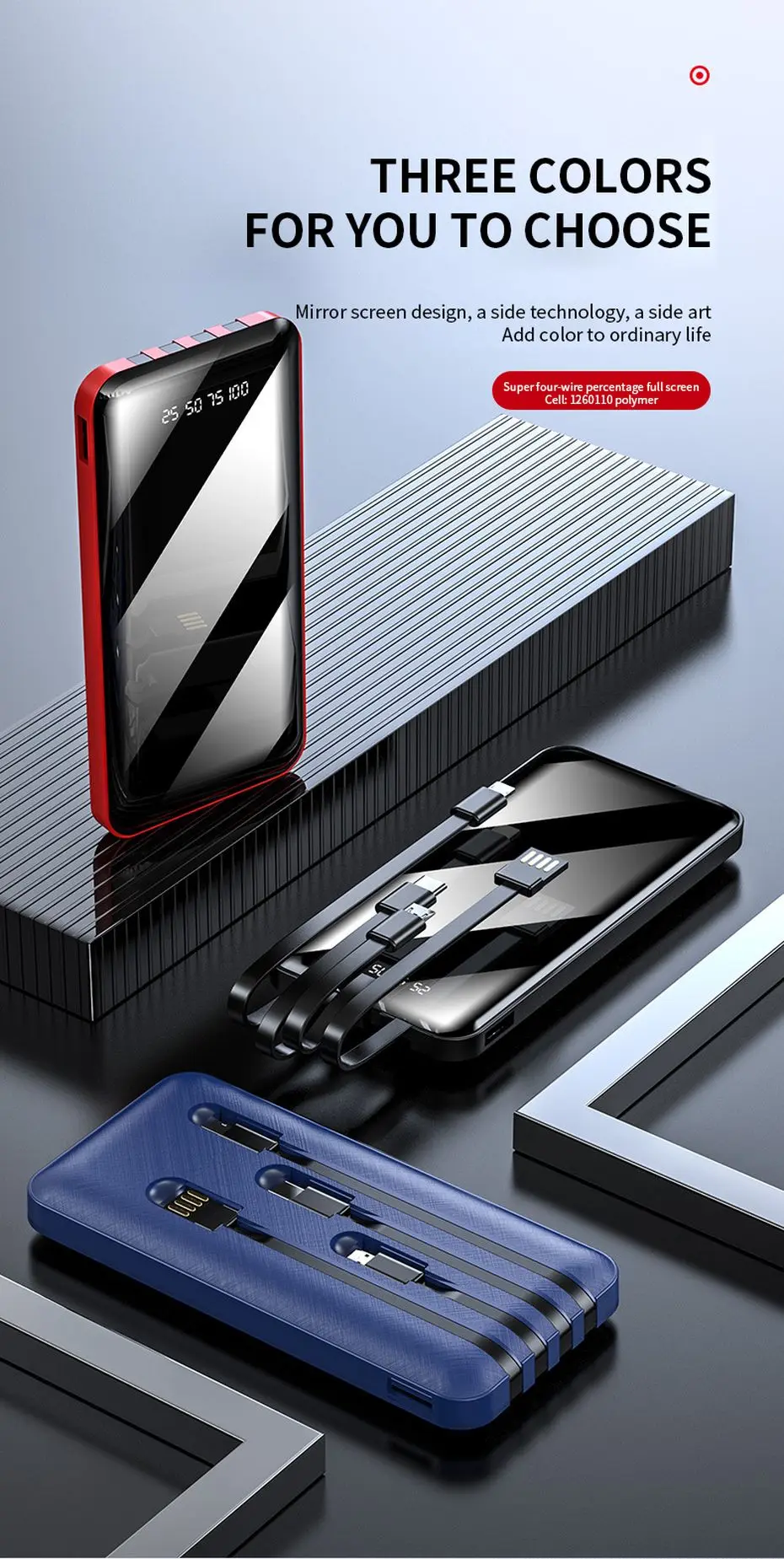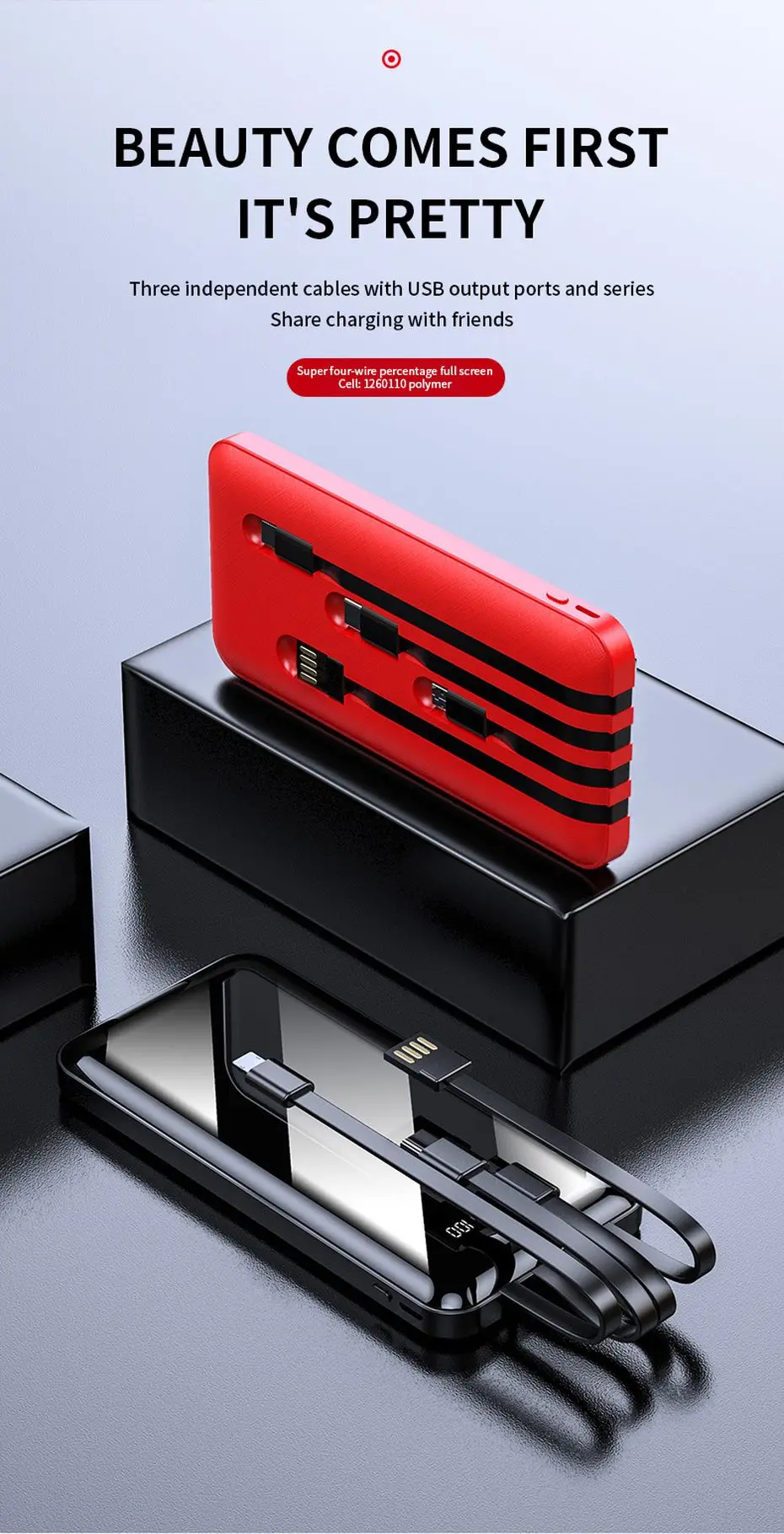 Портативное зарядное устройство PINZHENG, 20000 мАч, 4 встроенных кабеля, быстрая зарядка, внешний аккумулятор для iPhone, Xiaomi