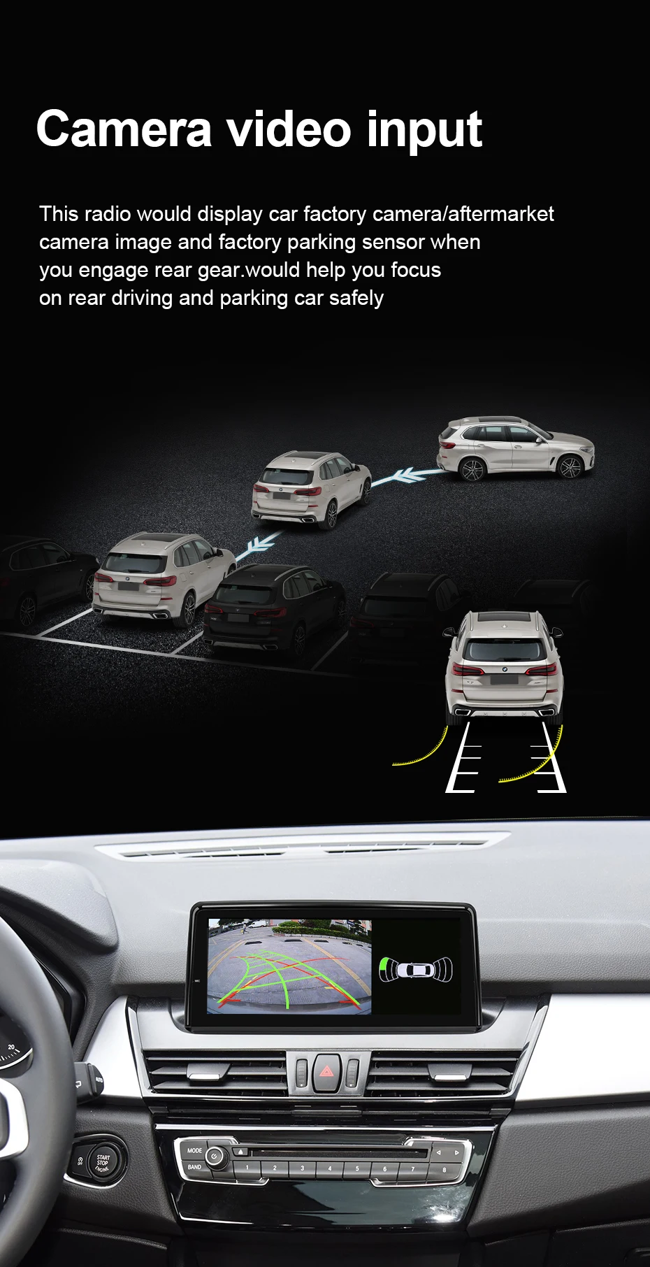 >>> Это головное устройство может автоматически поддерживать автомобильную камеру 360 / вторичного рынка и заводские датчики парковки на экране при включении задней передачи. Это поможет вам сосредоточиться на заднем движении и парковке автомобиля. универсальная камера - подарок для вас в комплекте.