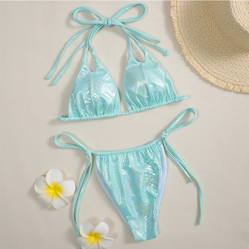 Бикини с принтом змеиной кожи, Женский блестящее бикини купальник-лямка через шею, женский купальник со складками, пикантный треугольный купальный костюм, бикини, 2020