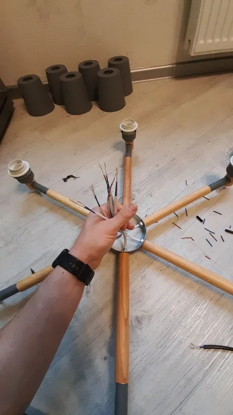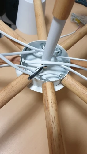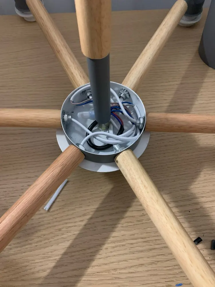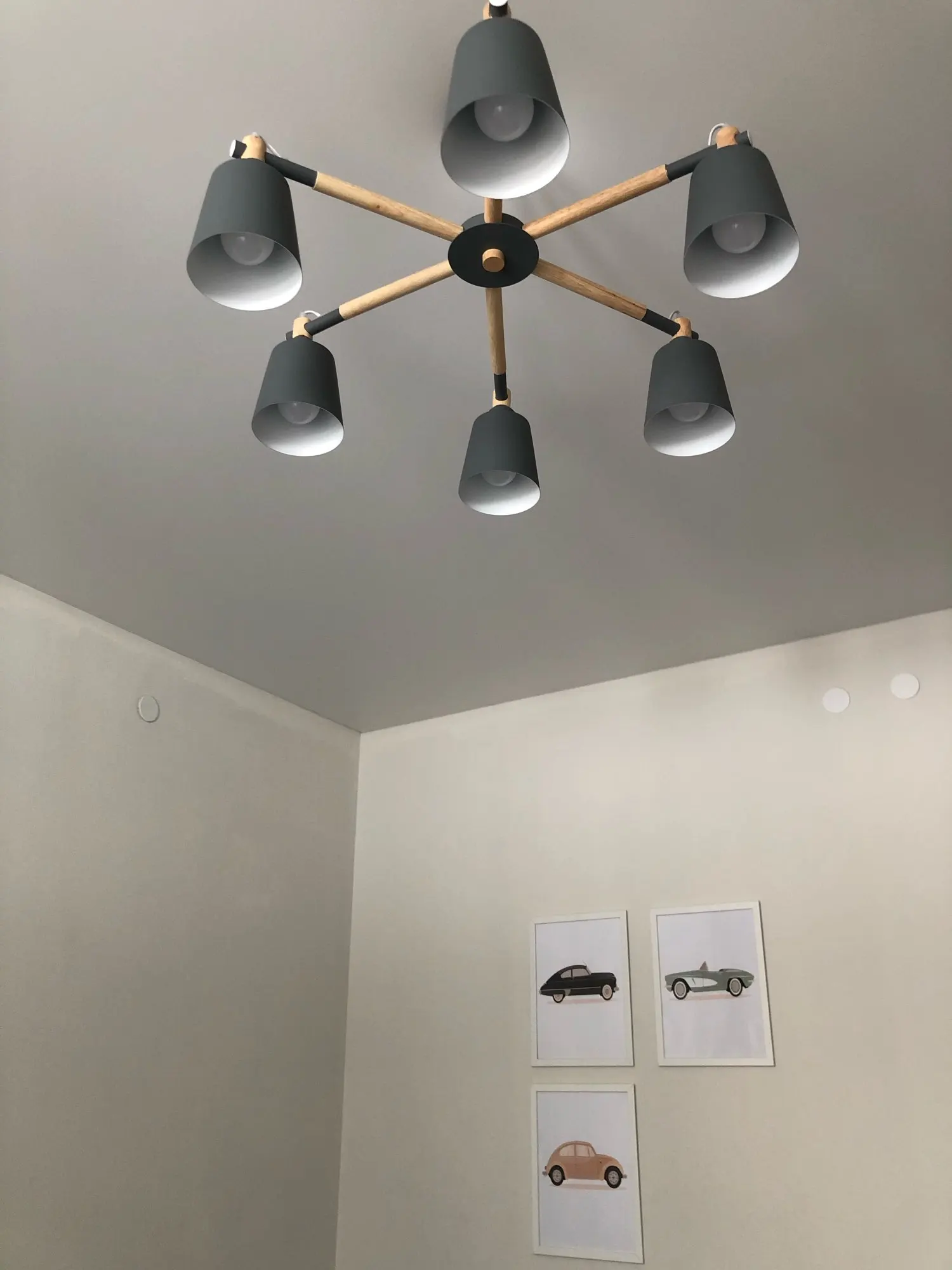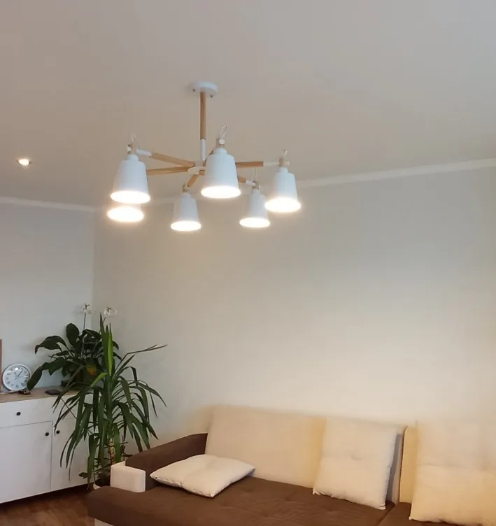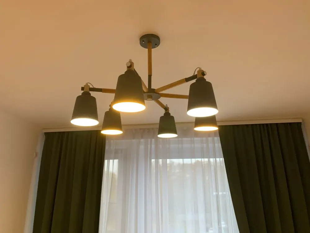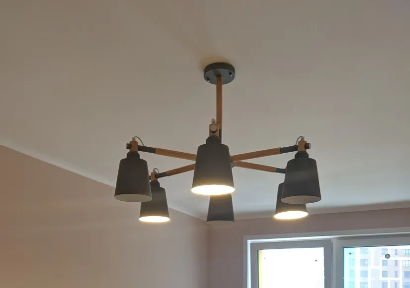 Бюджетная люстра (~40$), своих денег стоит, качество изготовления приемлемое. Покрашено ровно, критичных люфтов нет. В комплекте провода очень тонкие, явно не соответствуют своей маркировке (я сразу заменил на ГОСТ ПВС 2х0.75 в лучах и 3х0.75 в подвесе для возможности включения плафонов 3+3). Жаль что без ручной доработки (нужно пилить втулку с резьбой) нет возможности сократить длину подвеса, могли бы сразу положить в коробку две втулки, на разную длину подвеса. Упакована в коробку, внутри совсем мало иягкового материала, не слишком надёжная упаковка.