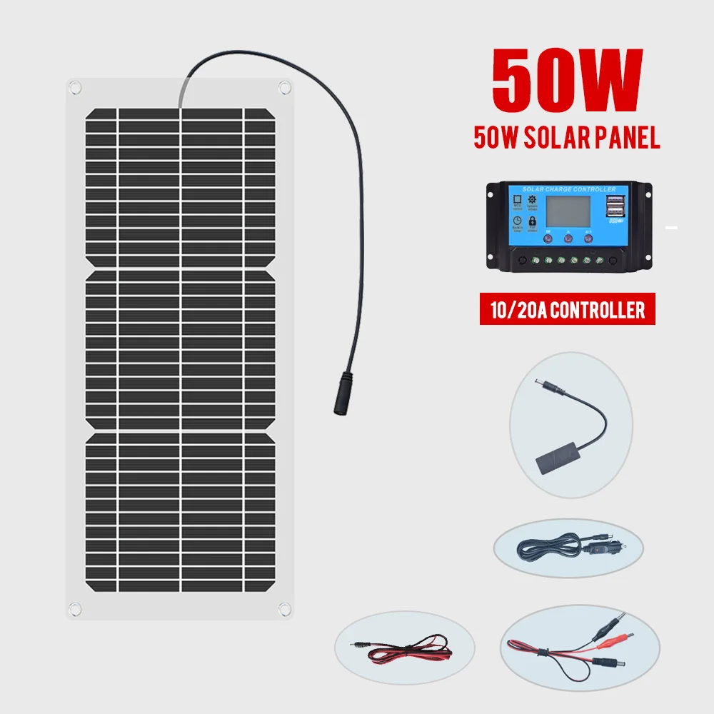Гибкая солнечная панель, 18 в, 100 Вт, 50 Втчдень, с контроллером 10 А, 12 В, 24 В, автомобильное зарядное устройство для автофургона, лодки, ЖК-дисплей, ШИМ-контроллер
