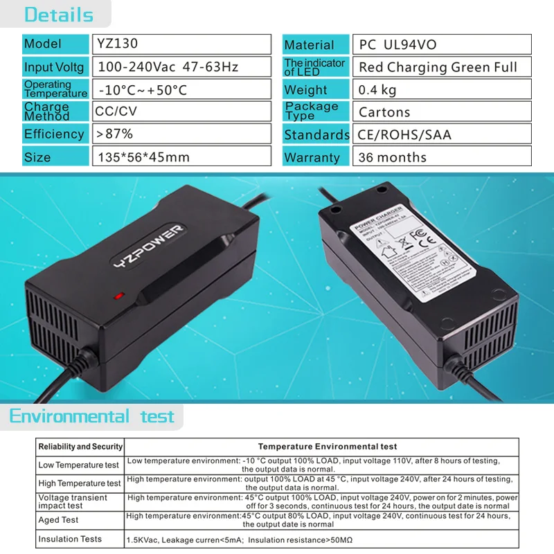 1) светодиодный индикатор двойного цвета: красный означает Charing, Зеленый означает полную зарядку. Гарантия 12 месяцев. 2) постоянный ток, конструкция двойной схемы постоянного давления, идеально соответствует характеристикам зарядки литиевой батареи. 3) используется двухсторонняя средняя схема потока, когда один из них поврежден, только зарядный ток уменьшается наполовину, и его можно использовать. 4) Время зарядки регулируется, светодиодный индикатор, точное напряжение и обнаружение тока, эффективно предотвращает перезарядку и полностью устраняет заряд недовольства и так далее. 5) Входные и выходные линии используют высококачественные провода, коррозионную стойкость и отсутствие трещин. 6) Корпус изготовлен из PC промышленного сырья, огнестойкого и огнезащитного, термостойкого 75 C.