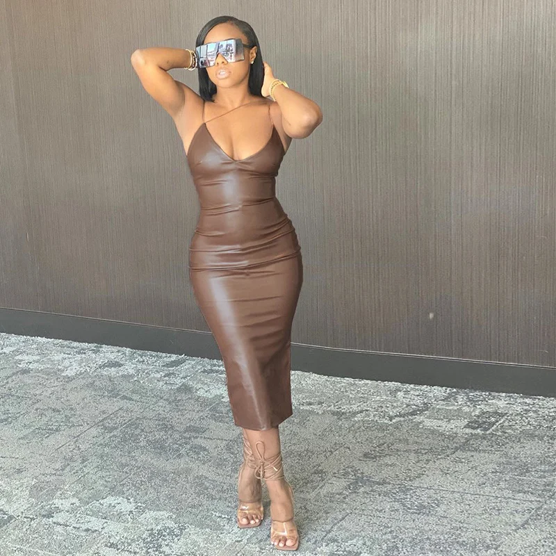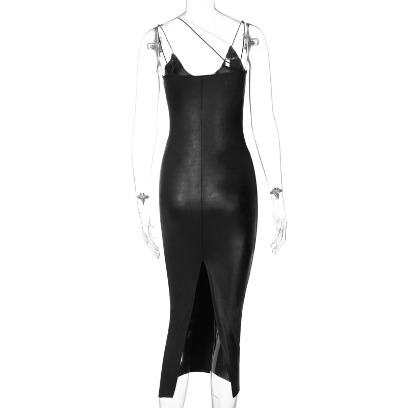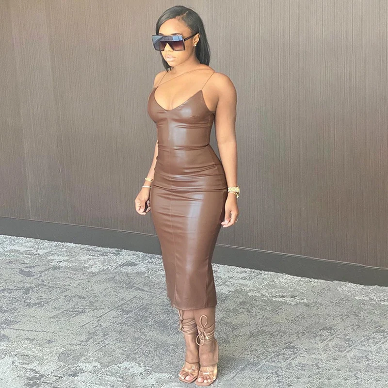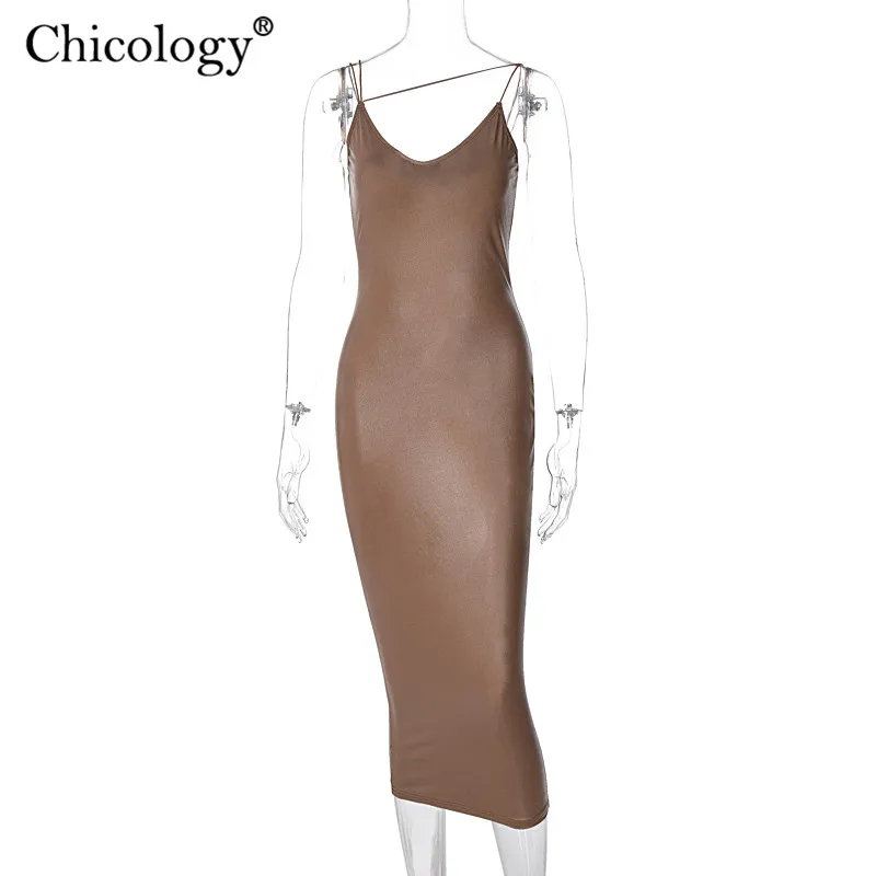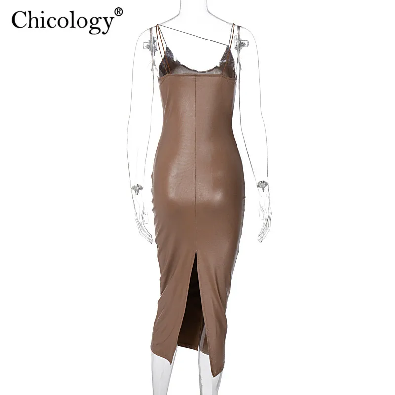 Chicology PU сексуальное элегантное платье миди на тонких бретельках Bodycon 2020 зимняя осенняя одежда для вечеринки, дня рождения, клуба, рождественские наряды