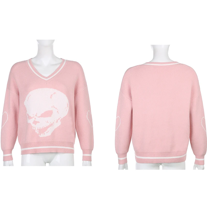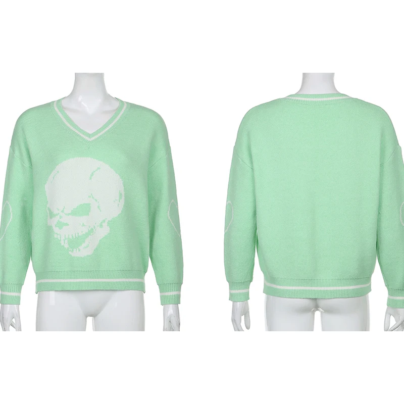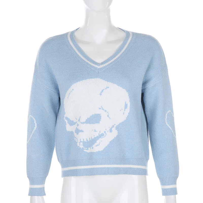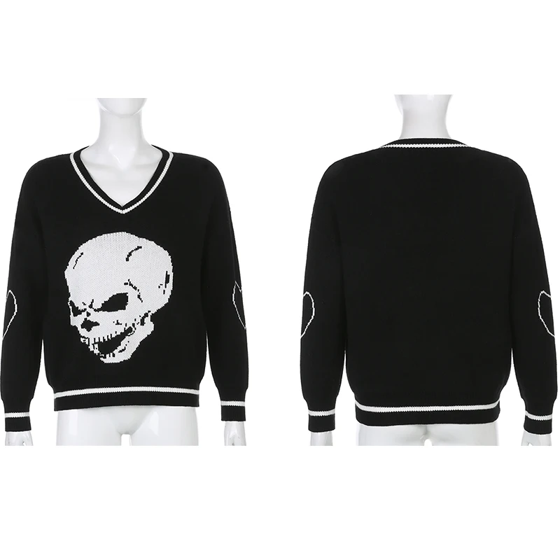 Свитер женский вязаный, с принтом черепа, с V-образным вырезом, осе...