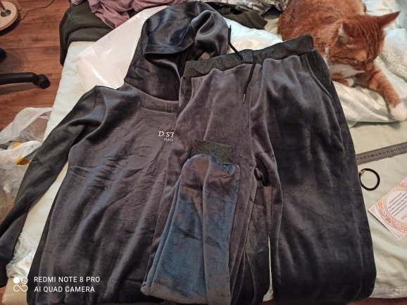 Это моя самая удачная покупка на Али. Костюм бомбический. Сел отлично. Пошит супер. Если одеть кеды Puma бархатные цвета Марсала или Вино, то вообще модельно и стильно. Спасибо за резиночку для волос в подарок. На мой российский 48-50 подошел xxl идеально. Манжеты из тонкой ткани, но это не страшно. Посмотрим до первой стирки. Кстати довольно теплый. Надела и через пару минут уже жарко было.