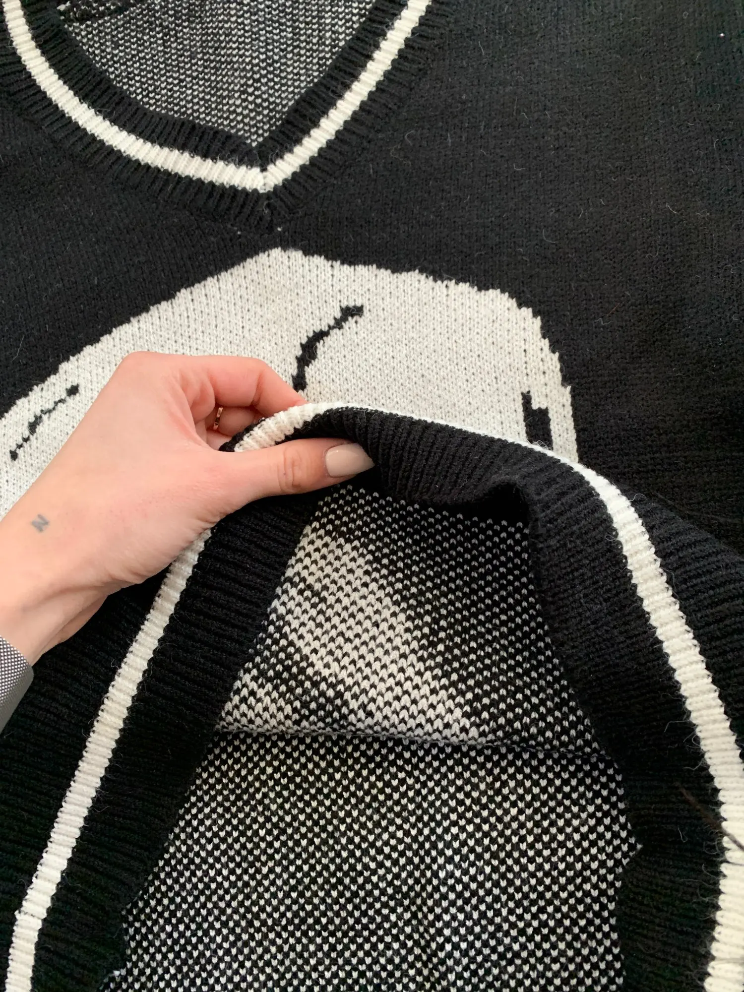 Материал очень удобный и высокого качества, хотя вырез шире, чем настоящий небеса, может подождать свитер, он все еще выглядит хорошо, и мне очень нравится. Я 5'5 и я заказал размер XL для большого размера, и он идеален. Единственное в этом-то, что вы можете увидеть некоторые Белые Нити под черным, но они только слегка заметны, а также некоторые нити были свободными, но их можно было легко зафиксировать