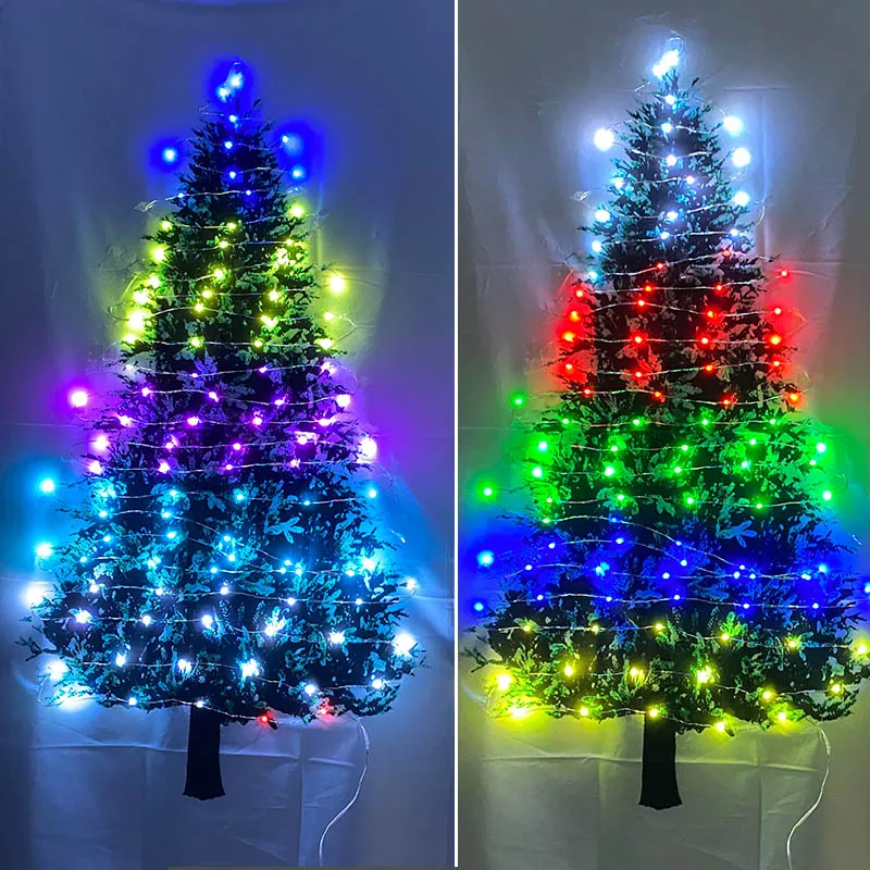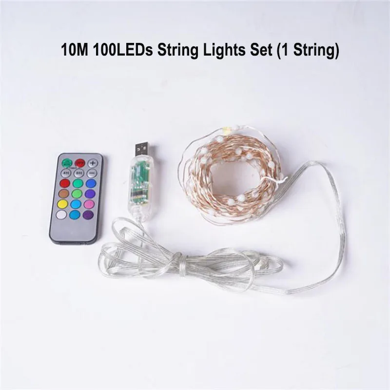Светильник с рождественской елкойДлина: 10 м 100 светодиодовСветодиодный Цвет: 12 цветов, RGBРазъем питания: USBИсточник питания: 4 ВтВходная мощность: 5 В постоянного токаУправление: Пульт дистанционного управления (батарея в комплект не входит)Пожалуйста, обратите внимание: если вы хотите, чтобы такой же эффект с фото, вы должны купить 2-3 комплекта этот свет по крайней мере.