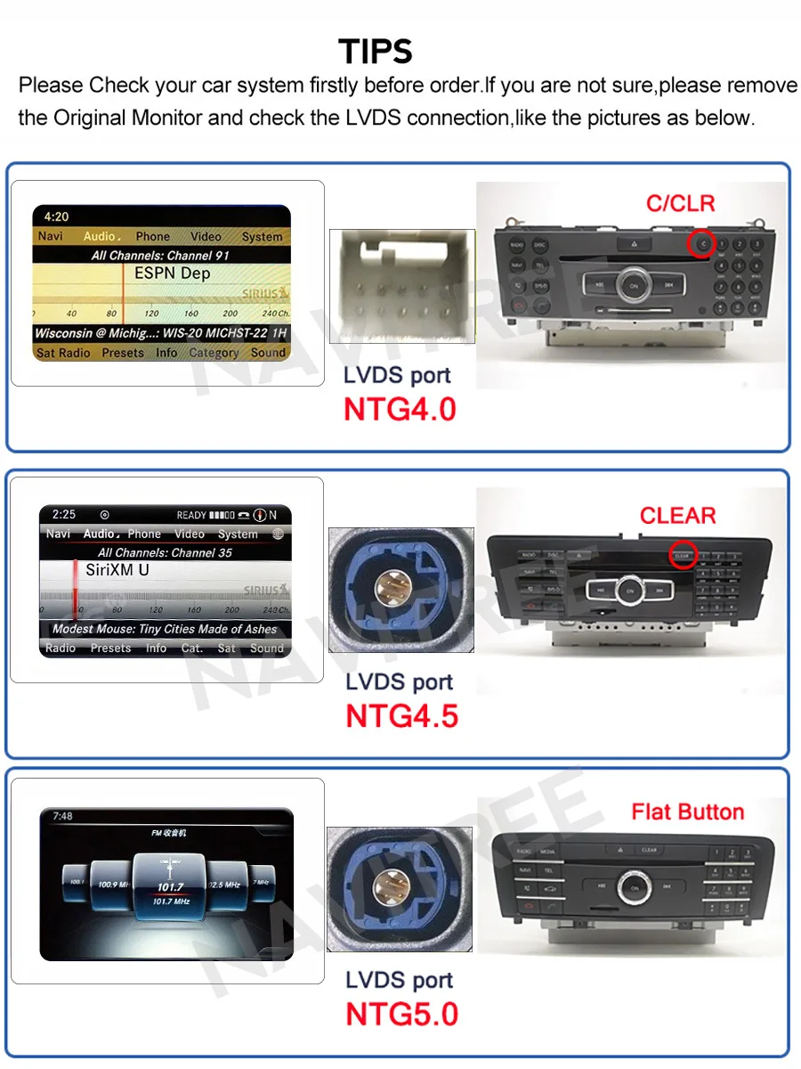 Пожалуйста, проверьте оригинальный радиоинтерфейс и порт кабеля lvds, чтобы узнать, какая система ntg вашего автомобиля! Если вы не уверены, пожалуйста, снимите оригинальный монитор и проверьте соединение LVDS, как показано на фотографиях ниже.