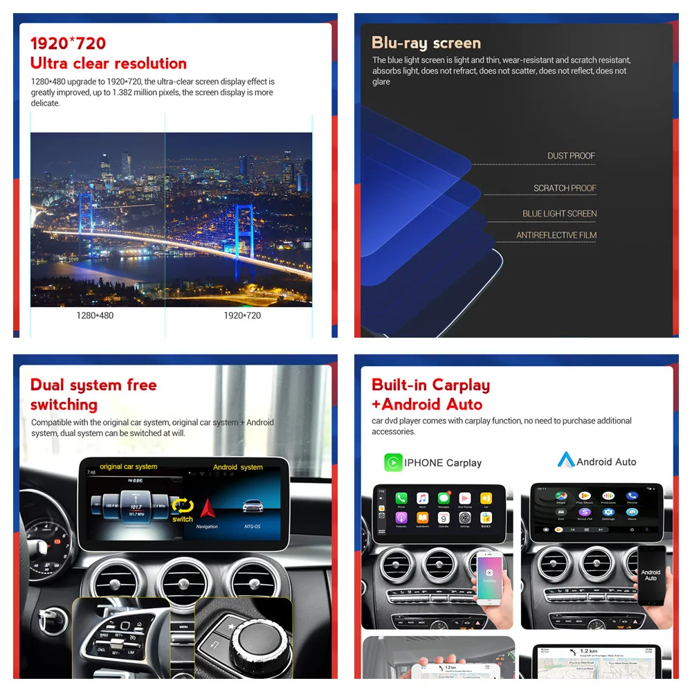 -10,25/12,5 дюйма Премиум IPS многоточечный сенсорный экран,Четкий дисплей в ультра-широком диапазоне обзора, 1920*720, Blu-Ray антибликовый экран