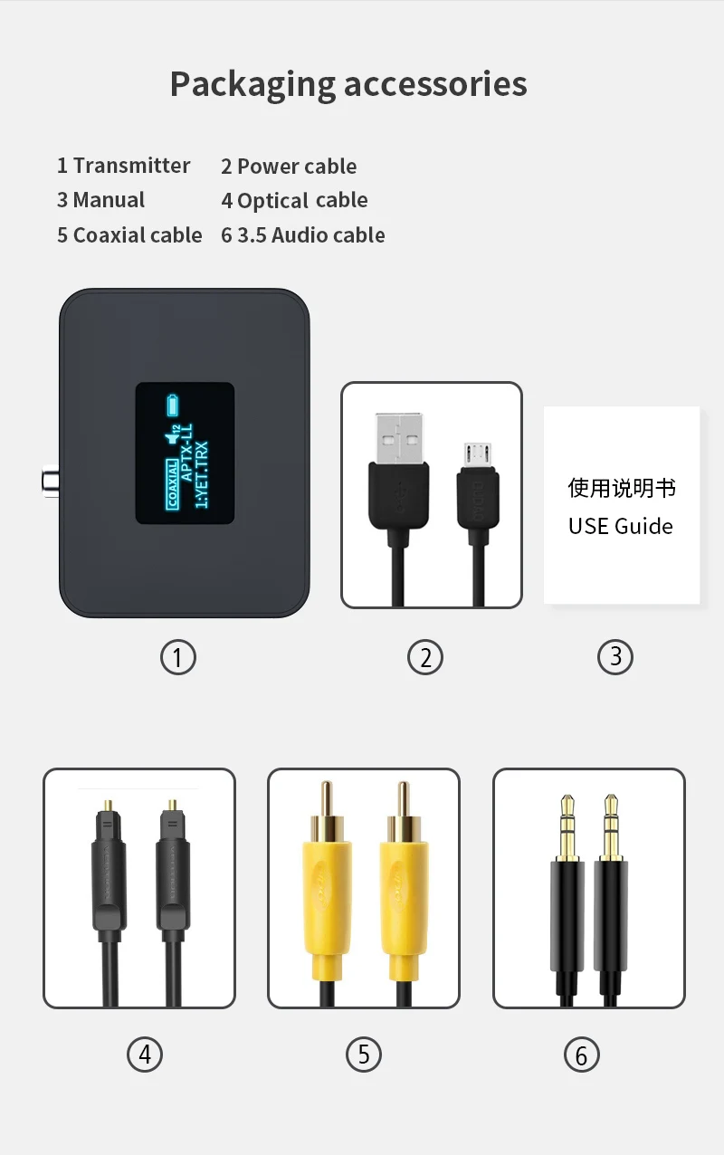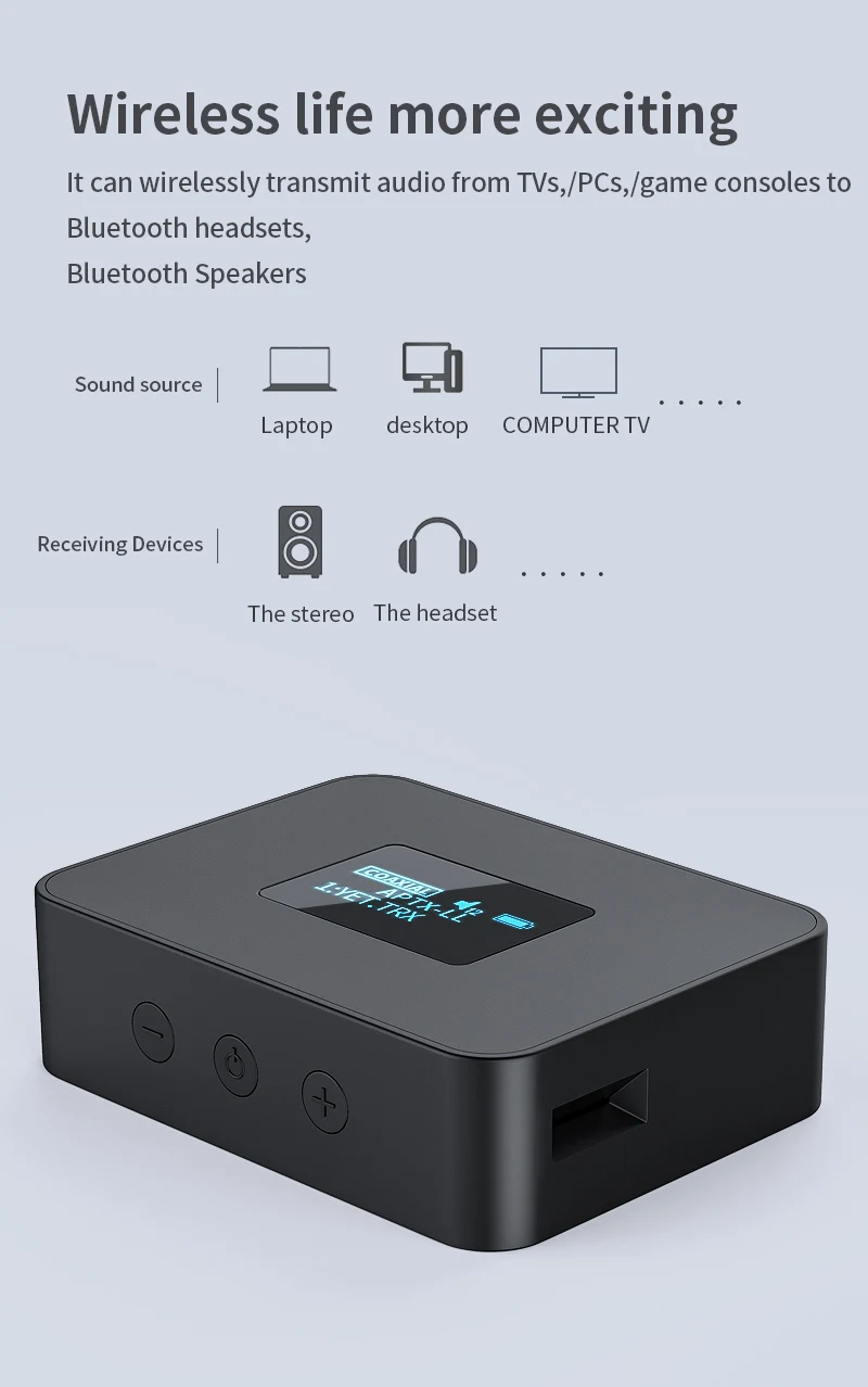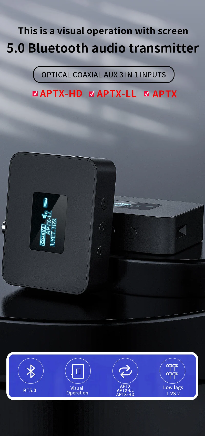1.OLED-экран2. Чип Bluetooth CSR8670: Поддержка APTX-HD/APTX-LL/APTX/ACC/SBC/A2DP/AVRCP3. Цифровой оптический Toslink SPDIF + коаксиальный + 3,5 мм AUX разъем три подключения4. Без потерь низкая задержка HD HIFI звук стерео музыка5. Сопряжение с двумя устройствами, режимами TX или RX