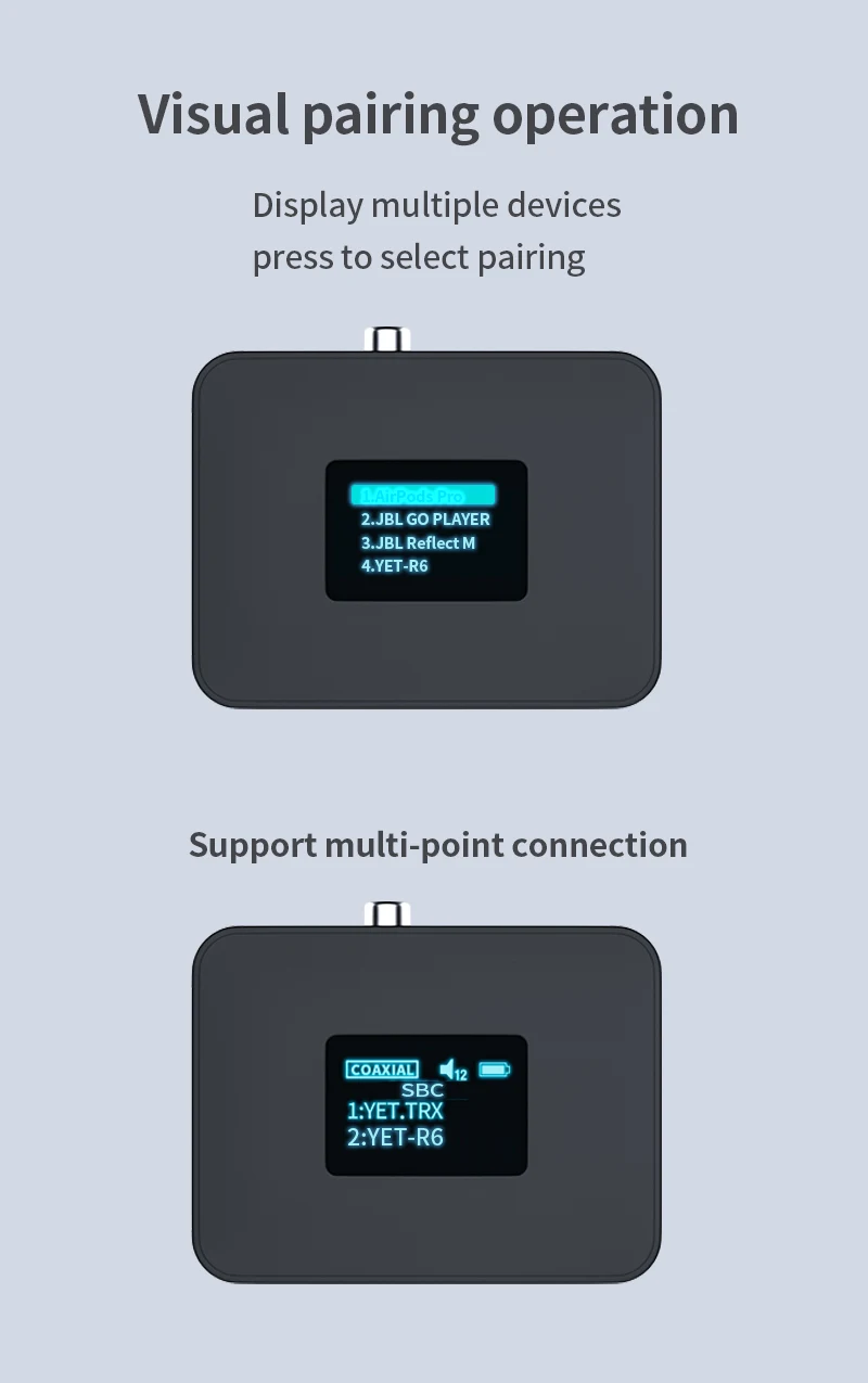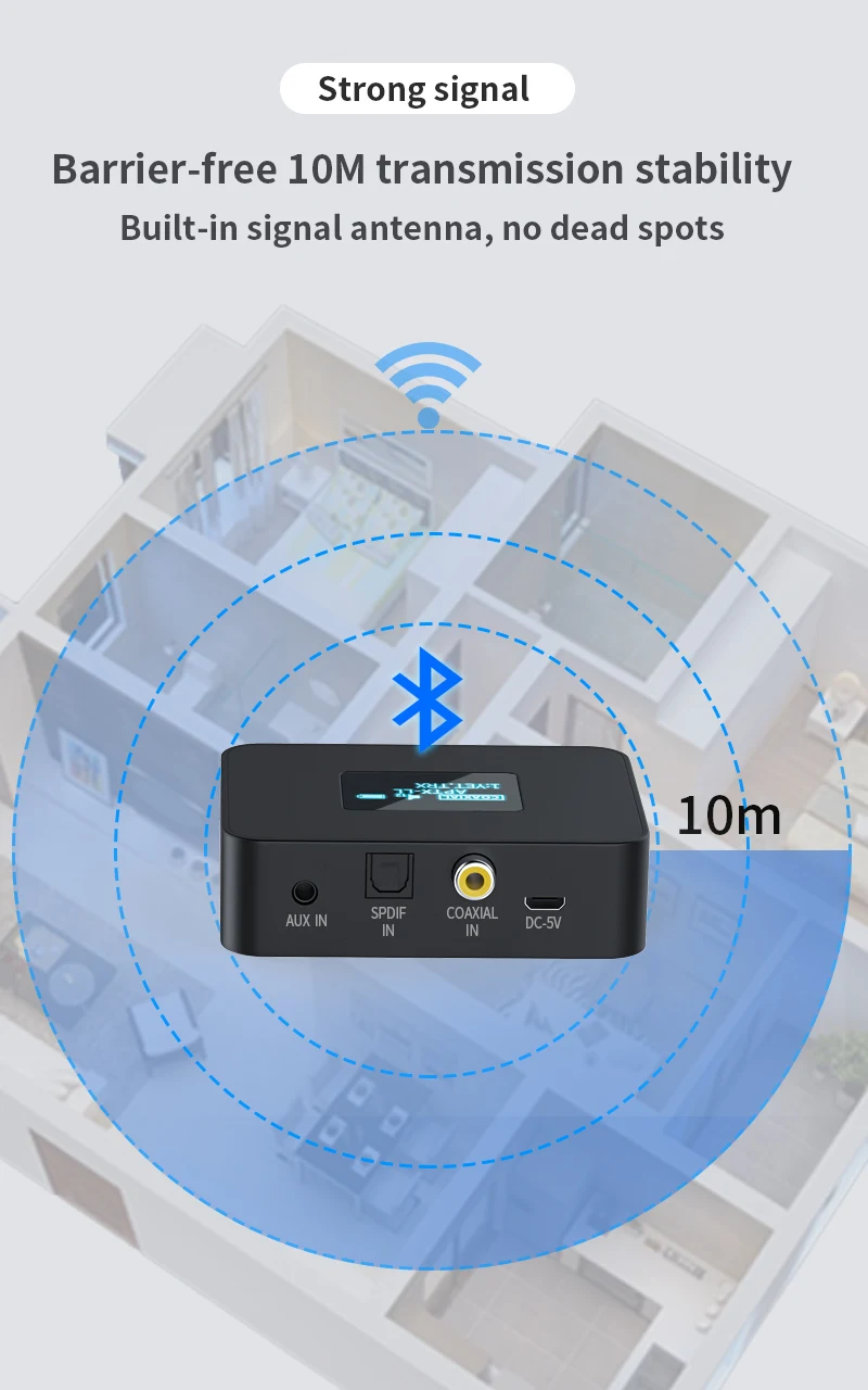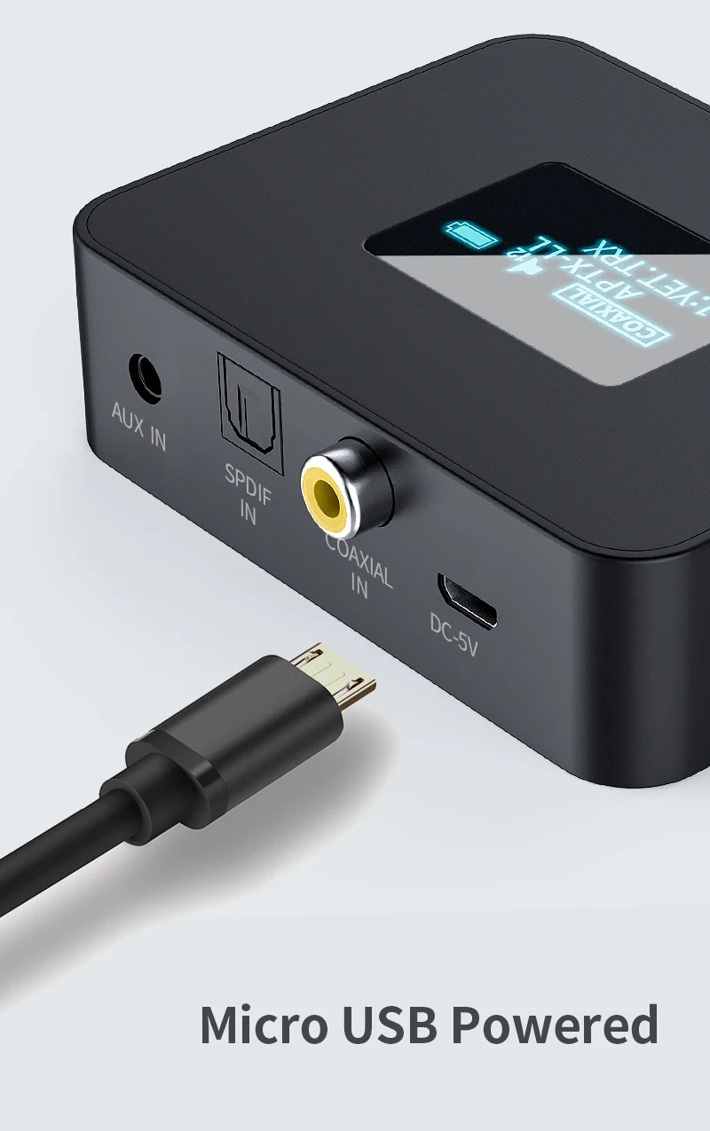 1.OLED-экран2. Чип Bluetooth CSR8670: Поддержка APTX-HD/APTX-LL/APTX/ACC/SBC/A2DP/AVRCP3. Цифровой оптический Toslink SPDIF + коаксиальный + 3,5 мм AUX разъем три подключения4. Без потерь низкая задержка HD HIFI звук стерео музыка5. Сопряжение с двумя устройствами, режимами TX или RX