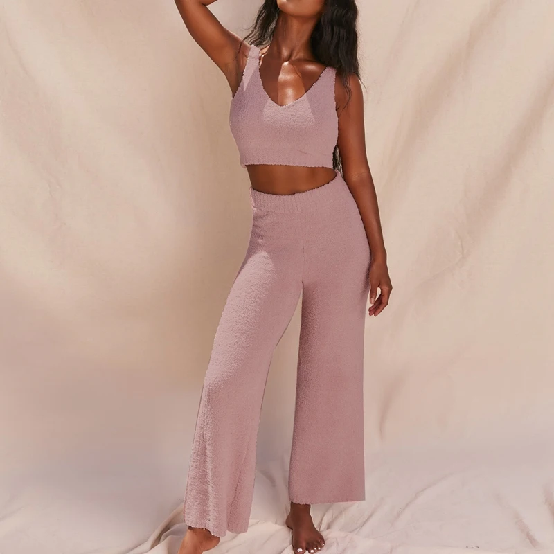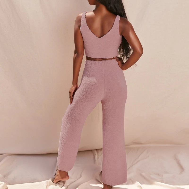 Хит, kf-Женский вязаный плюшевый комплект из двух предметов, сексуальный пушистый топ на бретелях с v-образным вырезом, штаны с высокой талией, домашний костюм