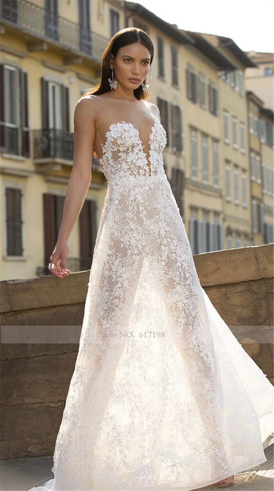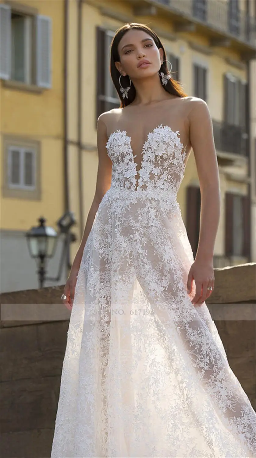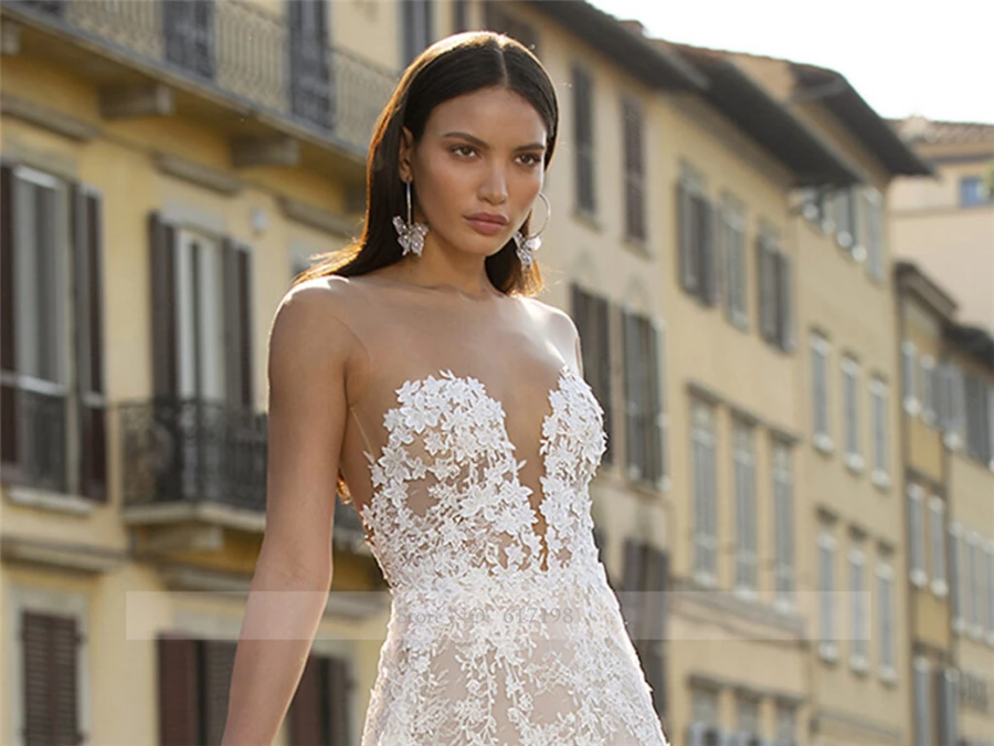 Прозрачное кружевное свадебное платье цвета шампанского с открытой спиной и шлейфом