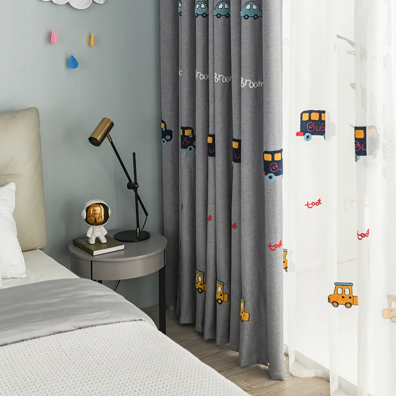 Занавески с мультяшными машинками для детской комнаты, для детской, гостиной, серые занавески с вышивкой, тюлевые, для спальни, высококачественные льняные занавески