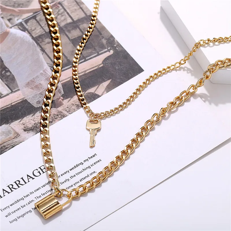 Цепочка с подвеской-замком женская, модное ожерелье с кулоном в виде висячего ключа, цепочка многослойная на шею с замком в стиле панк, цвет золотосеребро